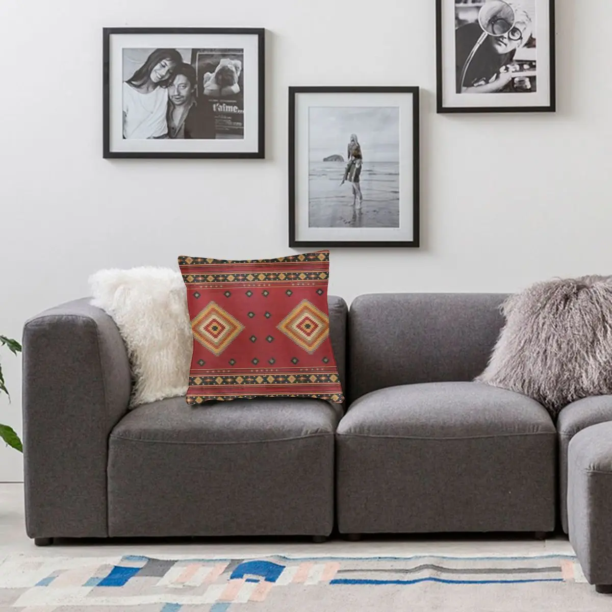 Абстрактная серая и красная подушка в современном стиле с треугольн...