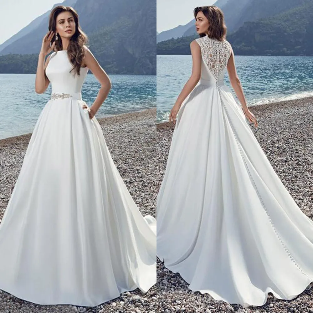 Атласное свадебное платье в стиле бохо ТРАПЕЦИЕВИДНОЕ кружевное платье с аппликацией из бисера и поясом, простое свадебное платье с карманом, свадебное платье принцессы, Vestido De Noiva