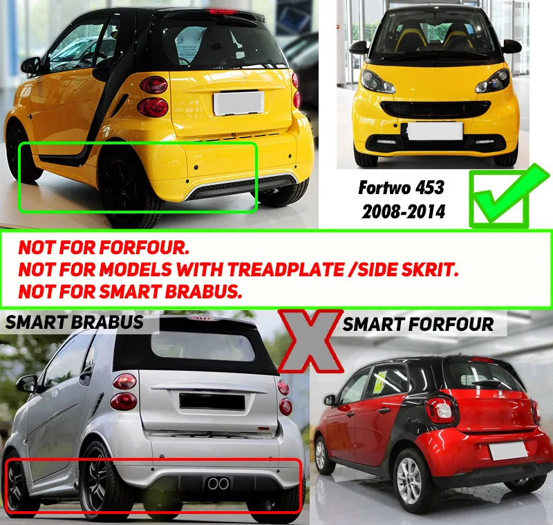 Фитинг: для Mercedes Benz Smart Fortwo A451 C451 2008-2014Для Mercedes Benz Smart Fortwo 2015-2019Не подходит для всех-Новый Smart Fortwo, подходит только для автомобиля на фотографиях.Не подходит для Smart BRABUS и Smart Brabus заднего бампера и заднего диффузора