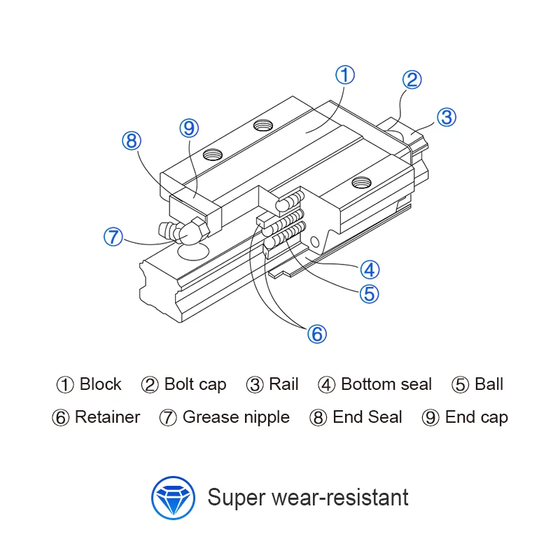 Система циркуляции прокатки: блок, рельс, Торцевая крышка и фиксатор.