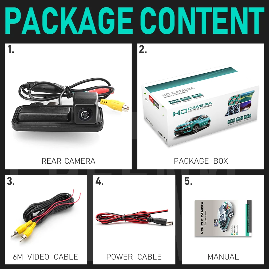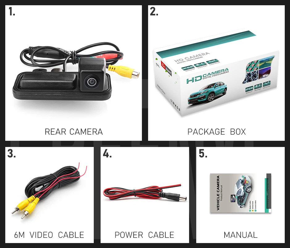 1. Задняя камера2. Коробка для посылка3. Видео кабель (6 м)4. Кабель питания5. Руководство пользователя