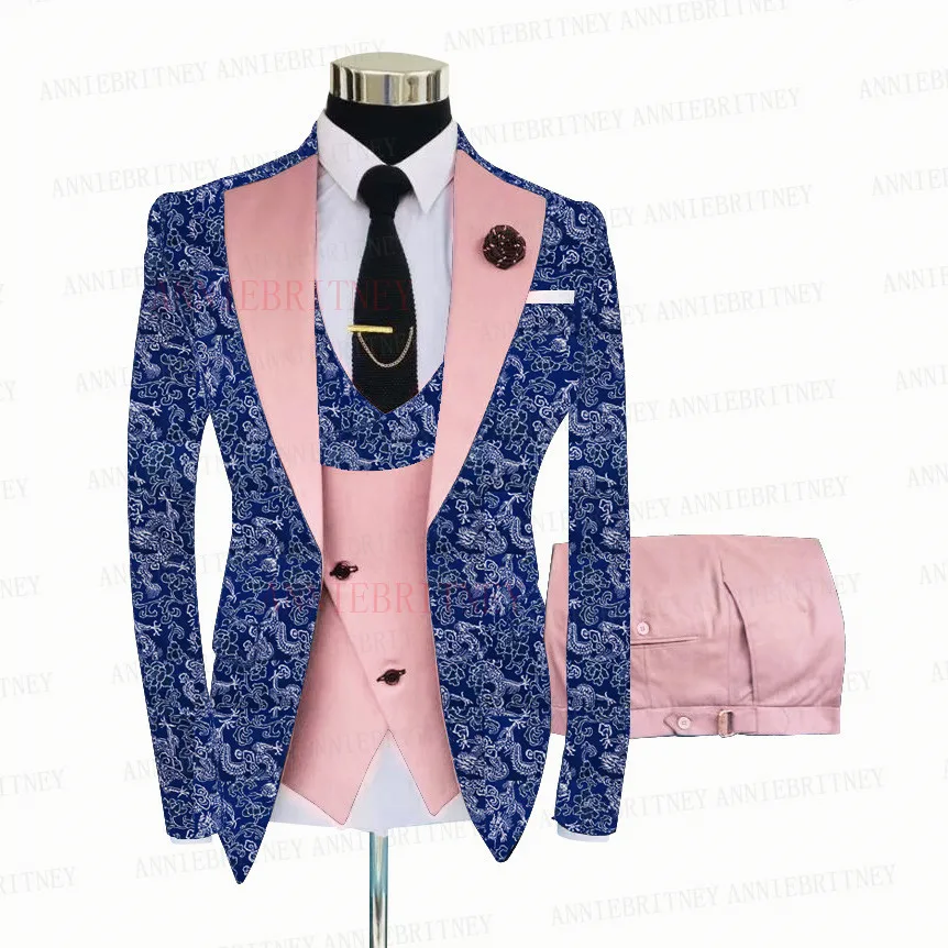 Модный синий мужской костюм с цветочным принтом 2021, свадебный смокинг для жениха из 3 предметов, облегающий Блестящий Блейзер, костюм, куртка, комплект из розового жилета и брюк