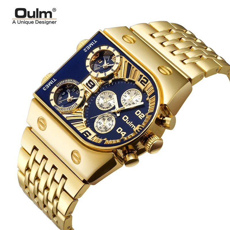 Часы Oulm с тремя часовыми поясами2021 новый стиль мужские большие наручные часыСветящийся указатель, больше и прохладнееВодонепроницаемые военные часы Golden 306L из стали