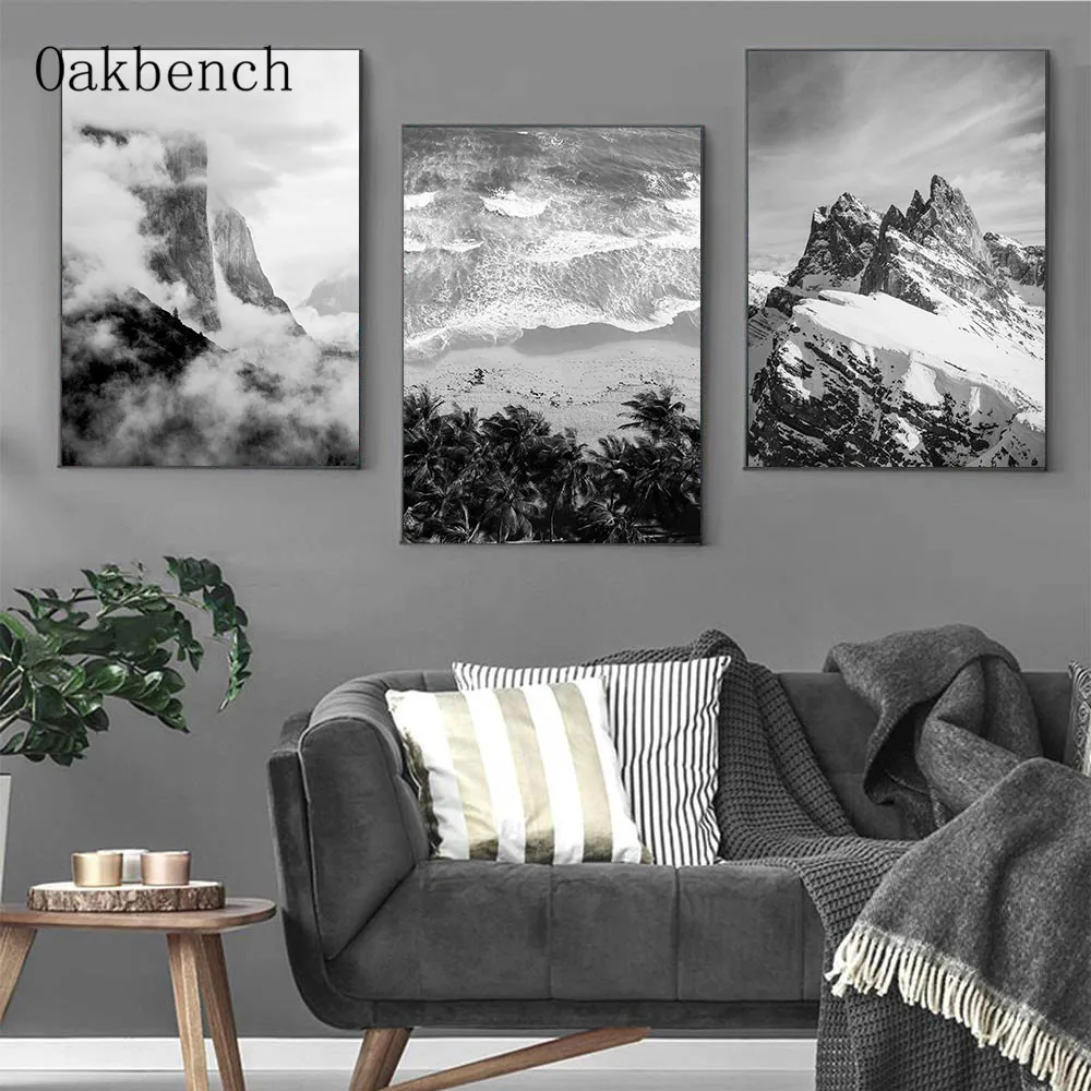 Черно-белый плакат пейзаж настенная живопись на холсте картина горн...