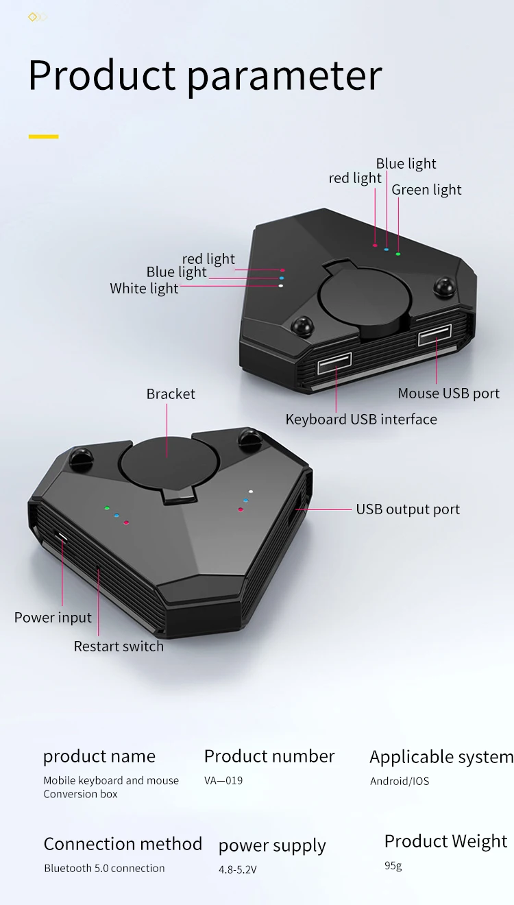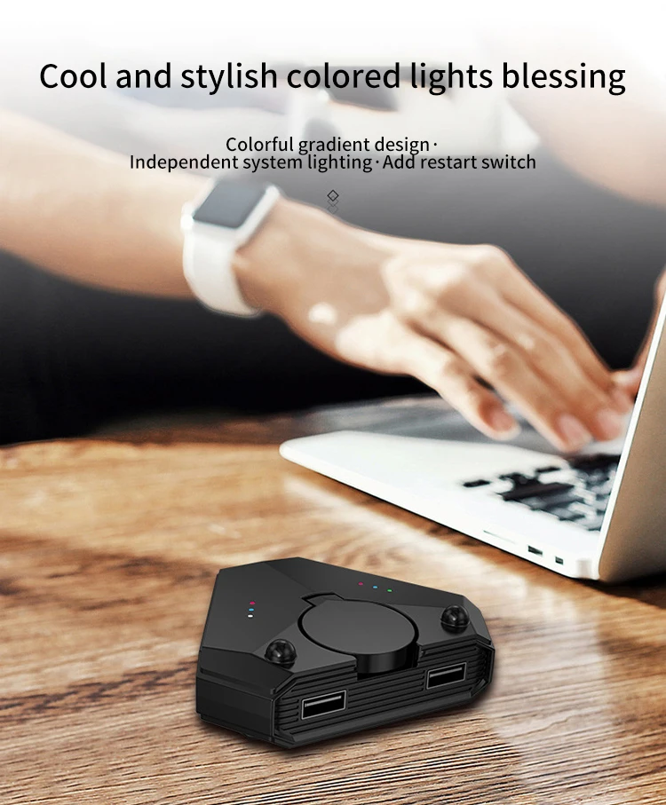 Многофункциональный конвертер-это многофункциональный конвертер мыши с клавиатурой, с функцией пушки под давлением, имеет мощную аппаратную технологию, независимые светильники Bluetooth и дизайн переключателя перезапуска, портативный и мини, С крутым светом и функцией usb-хаб, поддержка 5 В/2000 мА, есть три порта с высоким выходом usb 2,0,