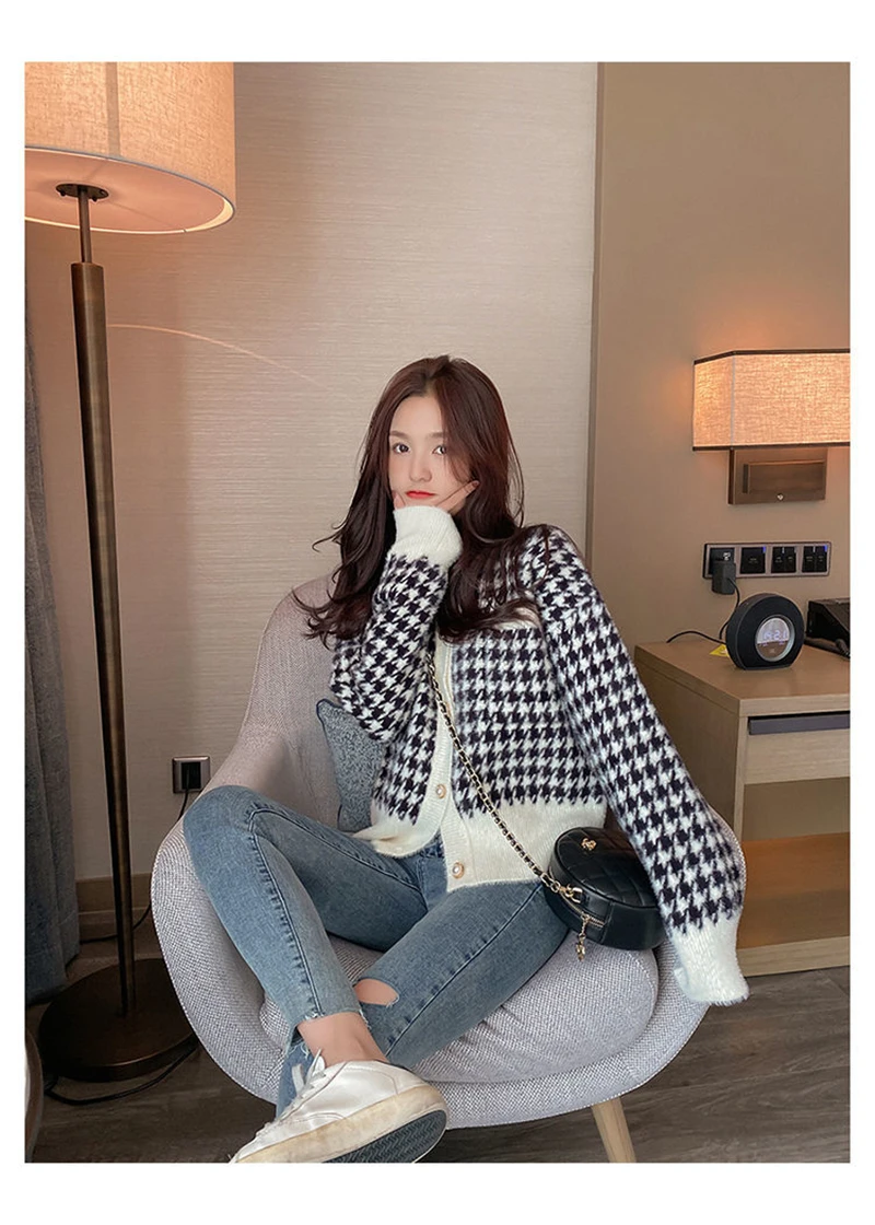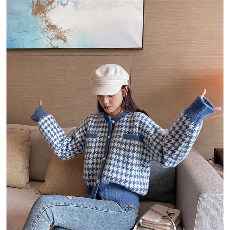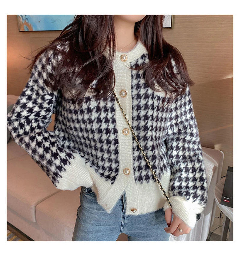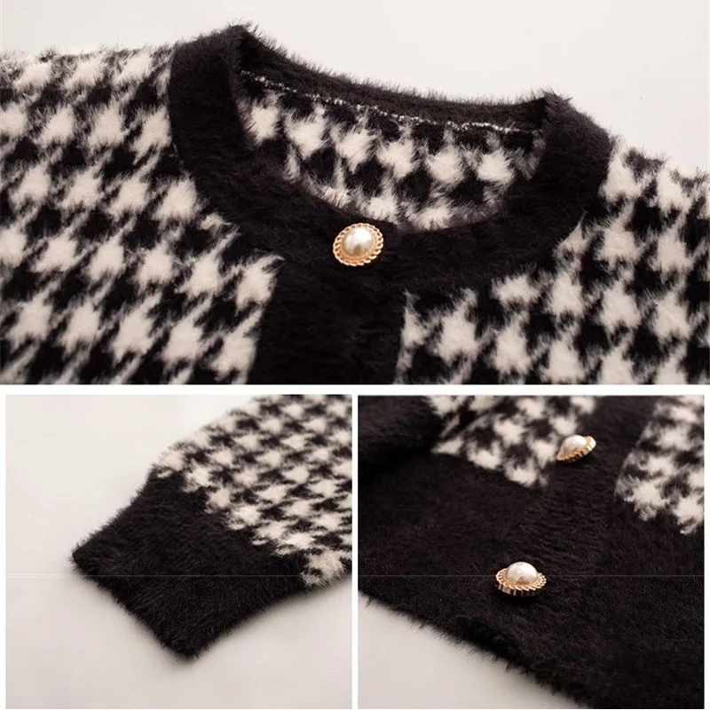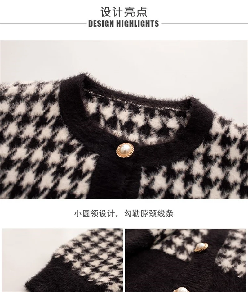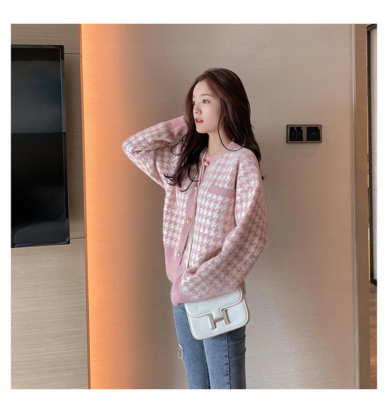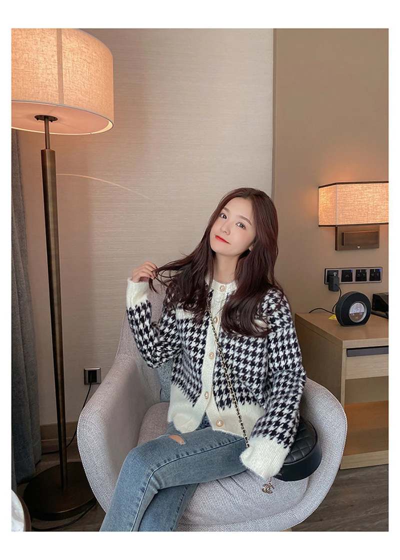 Короткий свитер в Корейском стиле гусиные лапки, кардиган, куртка, женская элегантная вязаная одежда из искусственной норки и флиса, топы, винтажные вязаные пальто с круглым вырезом