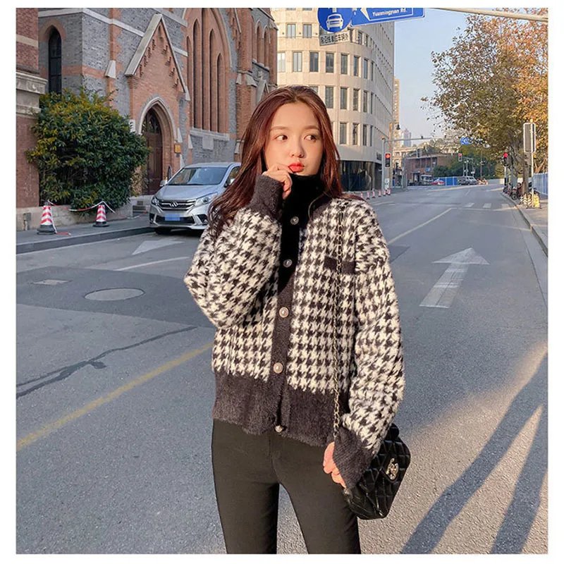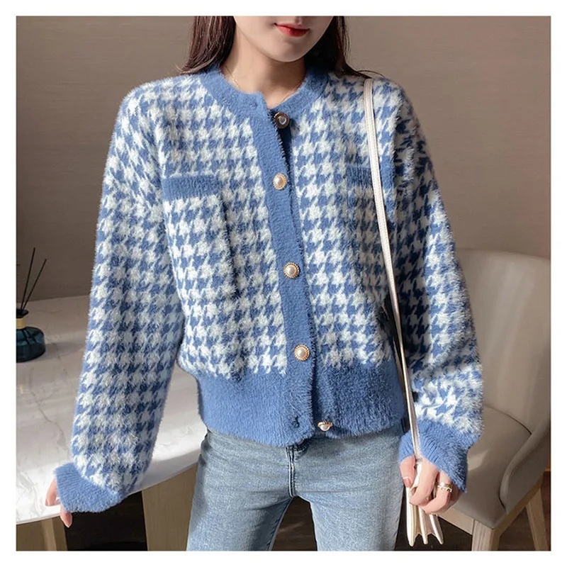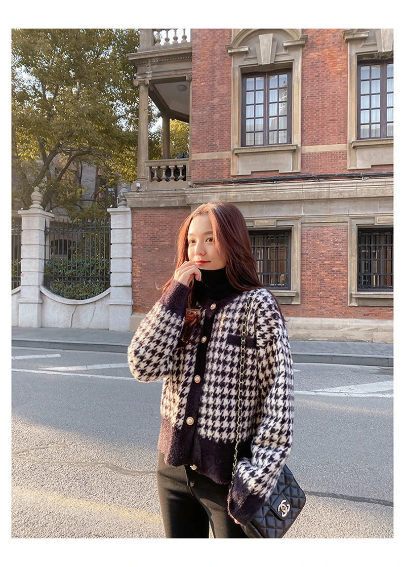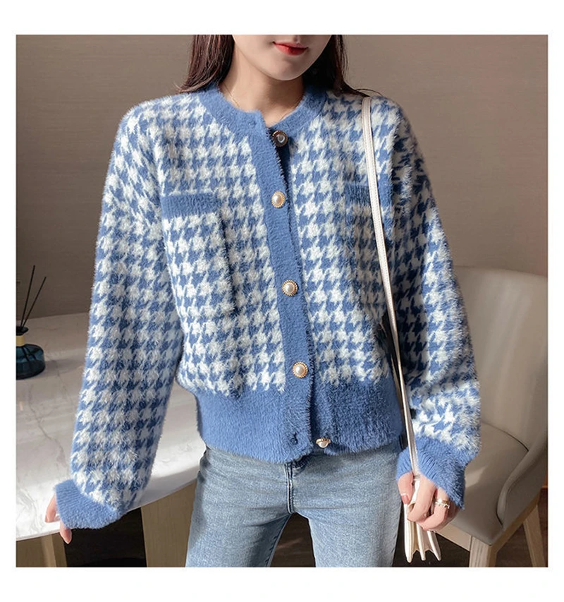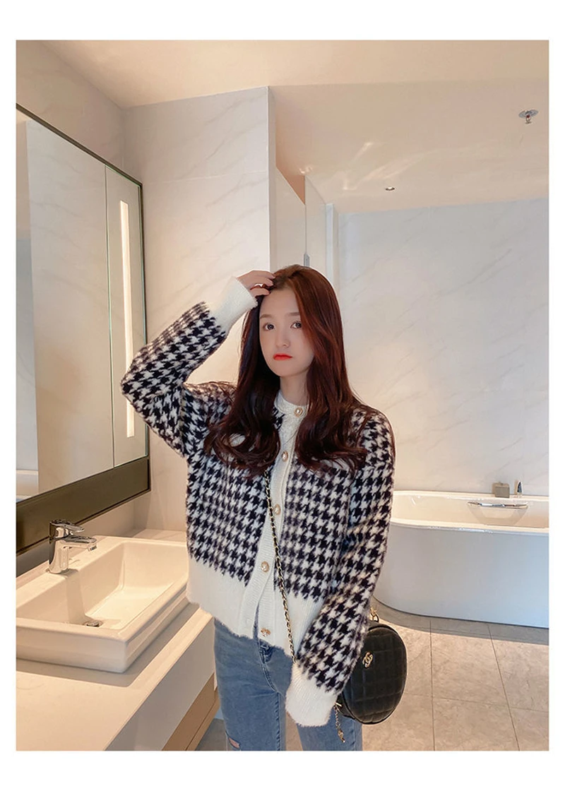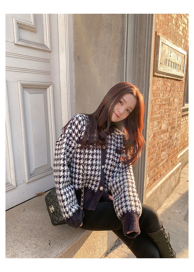 Короткий свитер в Корейском стиле гусиные лапки, кардиган, куртка, женская элегантная вязаная одежда из искусственной норки и флиса, топы, винтажные вязаные пальто с круглым вырезом