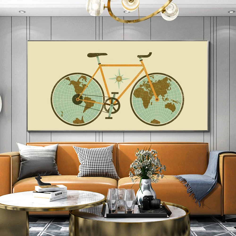 Настенная картина Карта мира на велосипеде, абстрактная живопись, постеры и принты на колесах, Настенная картина для гостиной, украшение для дома