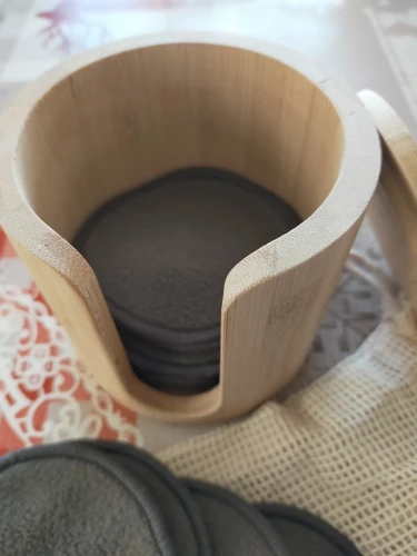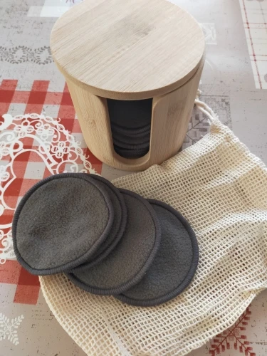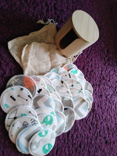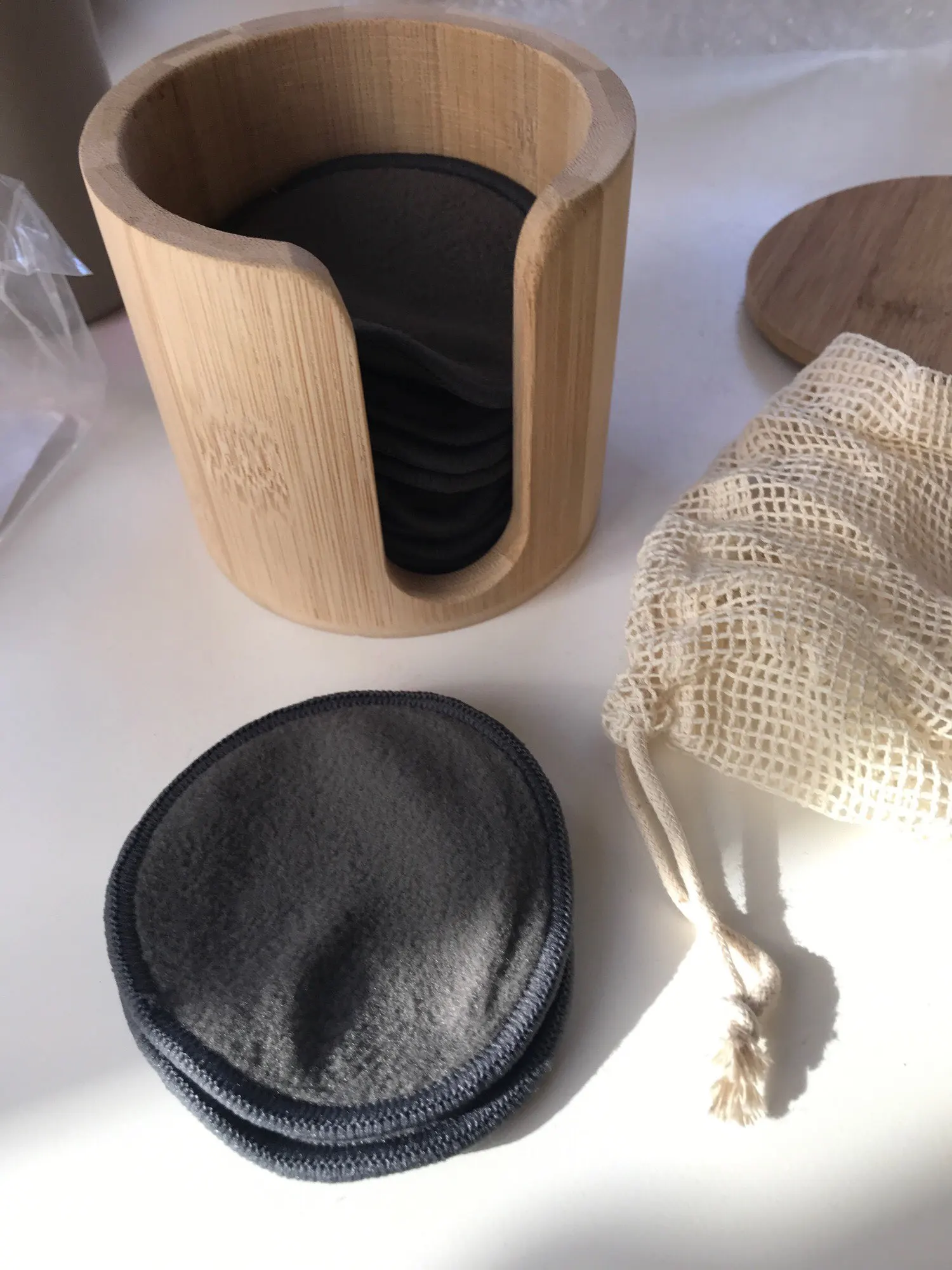 The wooden case & bag are beautiful and natural materials. The pads are definitely not bamboo cotton, but rather polyester. They are soft, but I don’t like the fleece feeling.. but the bag & wooden case are still worth it, so keeping the product.