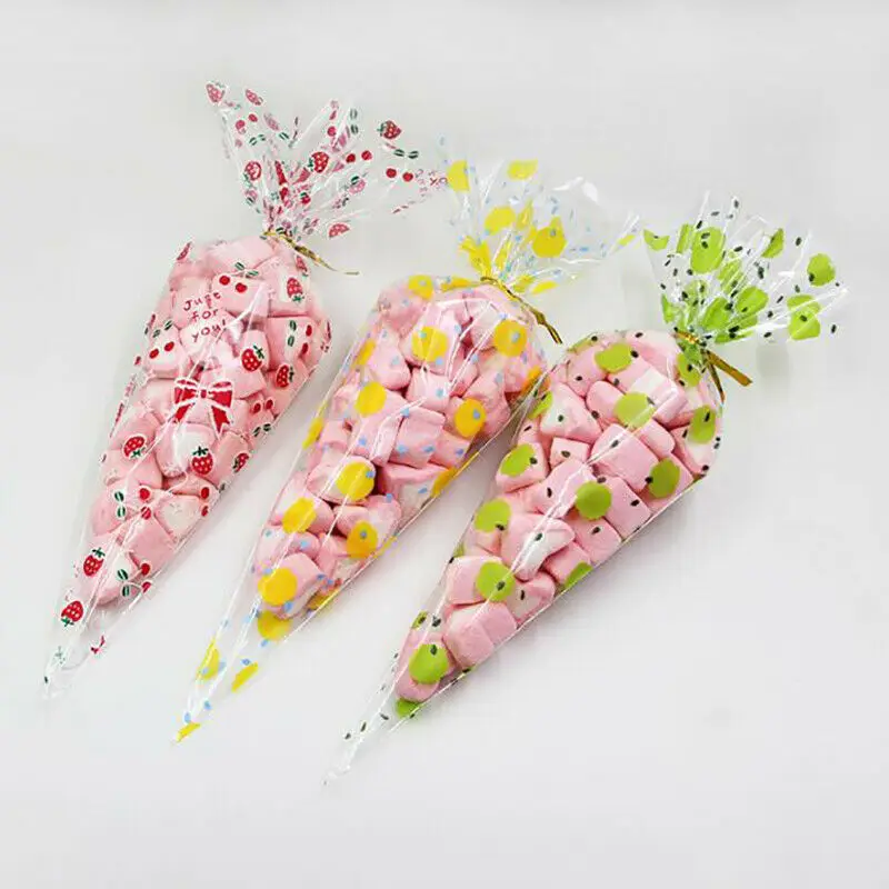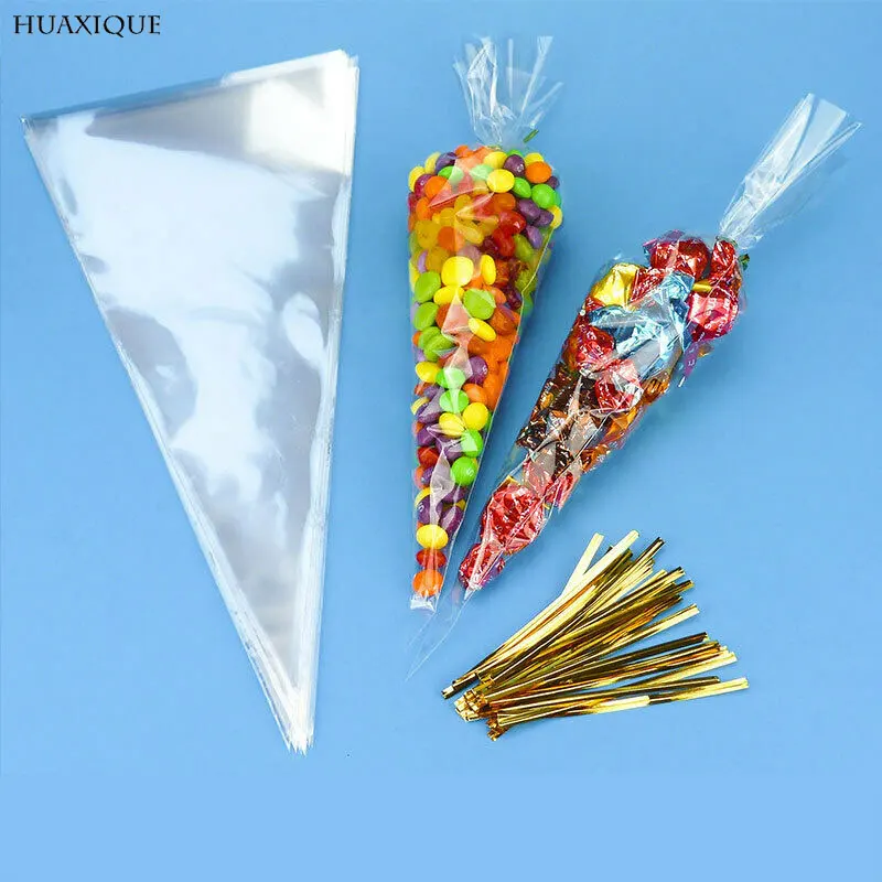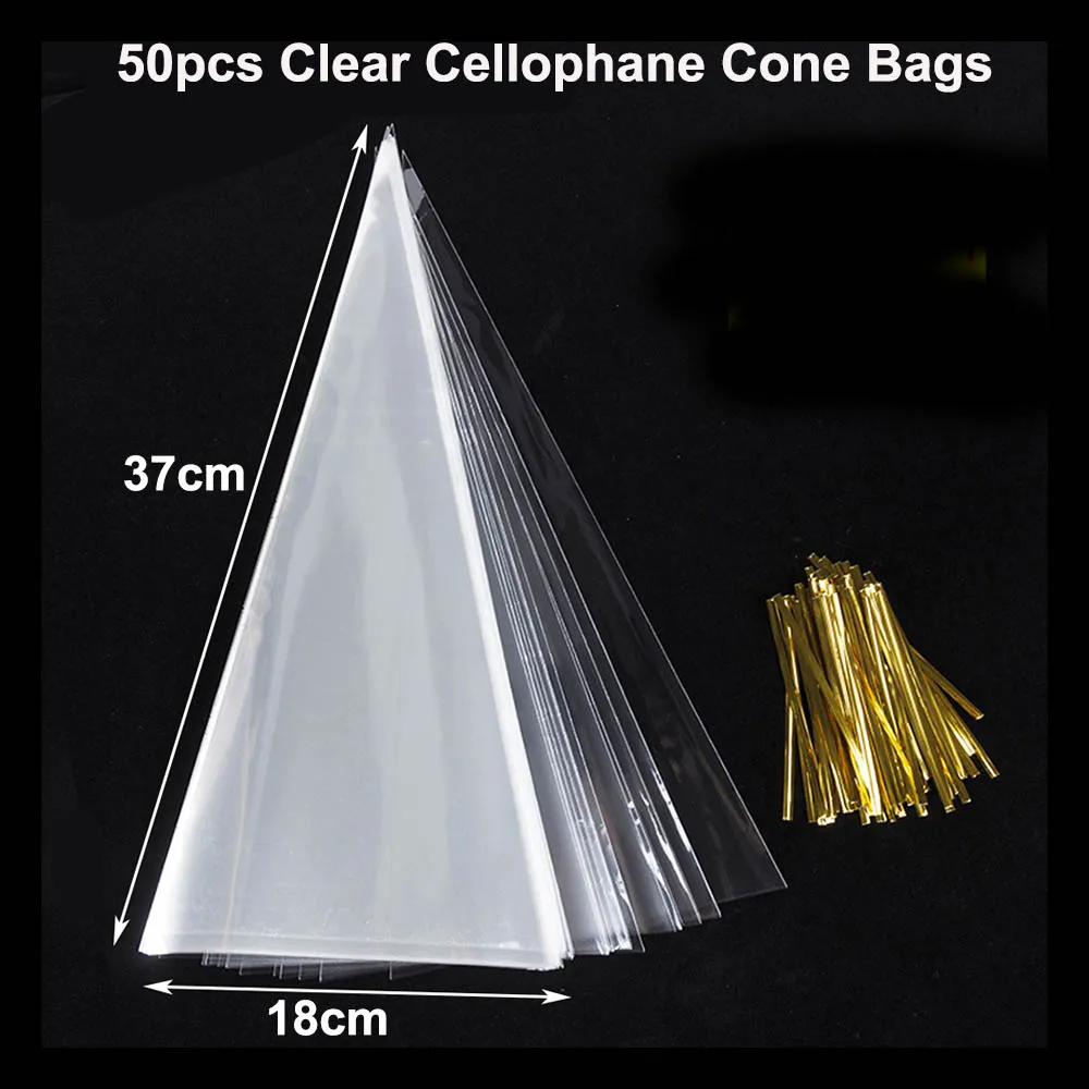 50 шт Прозрачные целлофановые Упаковочные пакеты для свадьбы, дня рождения, рождественской вечеринки, сделай сам мешочек для печенья, конфет, попкорн, пластиковая сумка в виде конуса