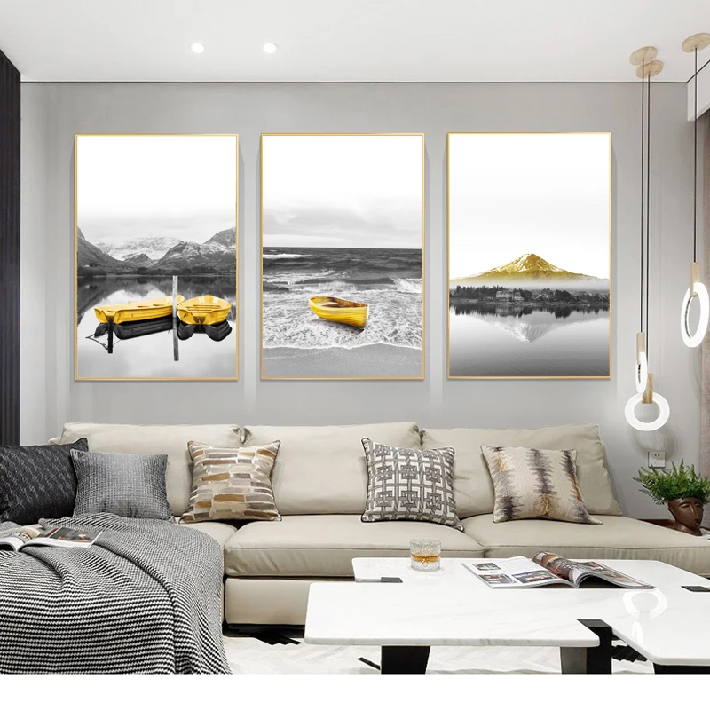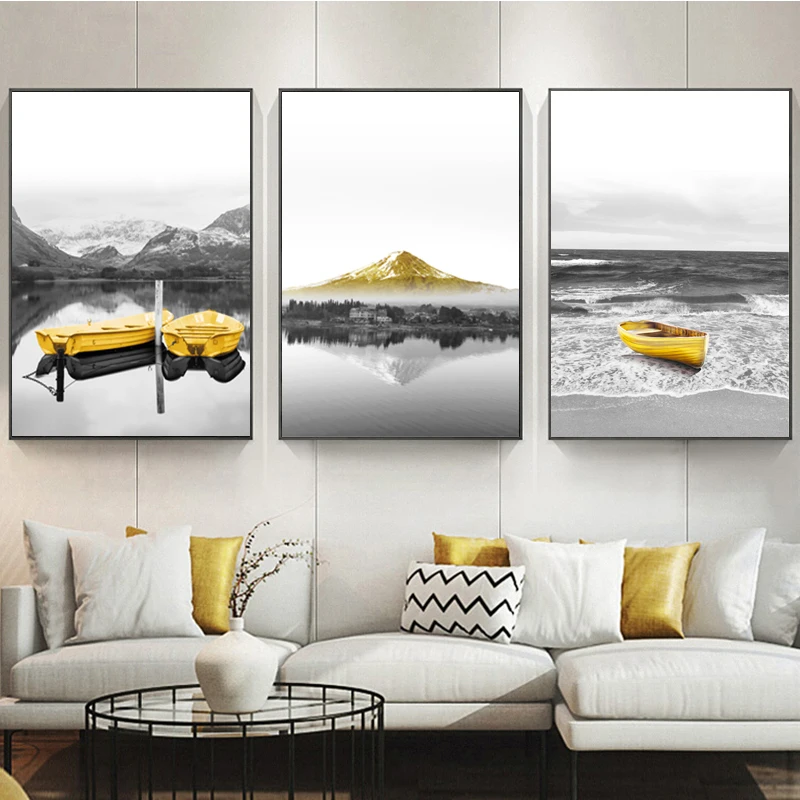 Современный горный пейзаж, Картина на холсте, Желтая Лодка на плакат с озером, принт, настенные картины для гостиной, Настенный декор, Куадрос