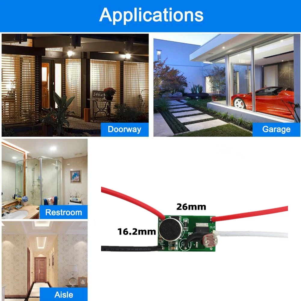 Этот продукт представляет собой панель управления переключателем звука, если в пределах требуемого диапазона, вы можете подключить любой продукт, который вы хотите контролировать, например, солнечную лампу, вилку DC коридорную лампу, гаражная лампа и так далее.