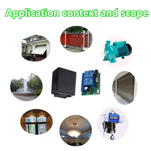 Продукты могут быть использованы в домашних условиях, фермах, фабриках, офисах, лабораториях, супермаркетах и так далее.Гаражная дверь с дистанционным управлением \ электрическая дверь \ домашняя дверь \ затворная дверь \ Расширительная дверь \ ворота \ дорожные воротаЭлектрический занавес с дистанционным управлением \ водяной насос \ вентилятор \ лампа \ Светодиодная лампа \ лампочка \ вентиляционное устройство \ передача сигналаДвигатель дистанционного управления с положительным и отрицательным вращением \ переключатель двигателя