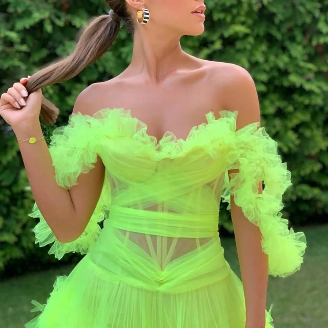 Неоновый зеленый свадебное платье многоуровневые оборки длиное Платья для вечеринок для Для женщин с открытыми плечами пикантные вечерние платья для выпускного с низким вырезом на спине, Vestido De Mulher; 2021