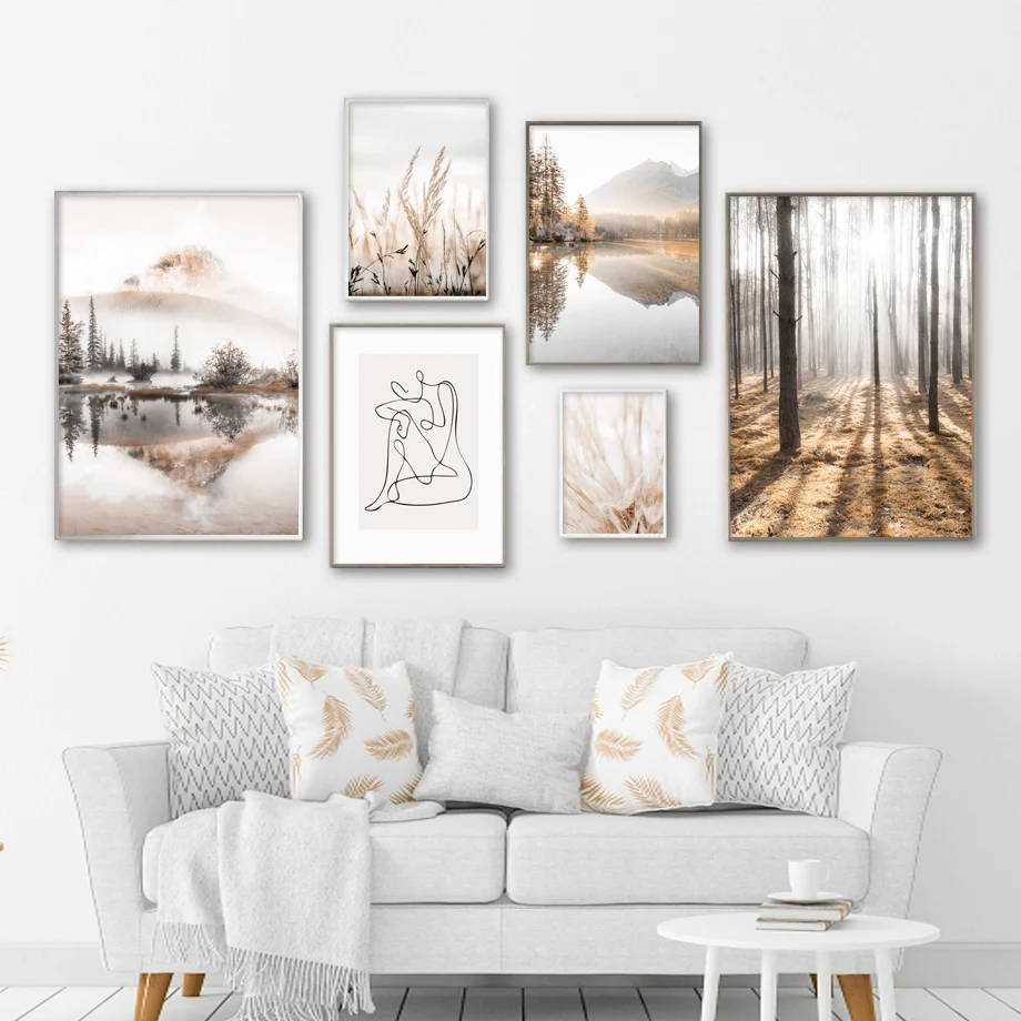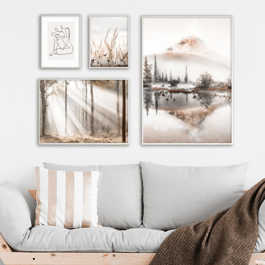Картина на холсте в скандинавском стиле с изображением горы озера Рида леса абстрактной девушки, Осенние настенные картины для украшения гостиной
