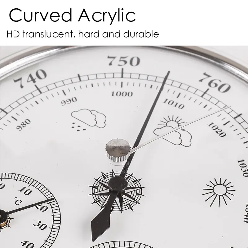 Особенности:1,3 в 1 дизайн: с барометром, термометром и гигрометром, 3 в 1 Функция, практичная. И многофункциональный.2. Настенный светильник: легкий и простой в установке, подходит для подвешивания на стене или размещения на поверхности.3. Функция: Может использоваться для измерения изменений параметров температуры, влажности, атмосферного давления, это может быть отличным инструментом для домашнего прогноза погоды.4. Широко используется: подходит для использования в помещении и на открытом воздухе. Идеально подходит для установки в патио, сад, ланай, гараж, гостиную, офис и многое другое.5. Удобный в использовании: классический и практичный. Никаких специальных ремонтных работ не требуется во время длительного использования, батарея не требуется.6. Материал хорошего качества: Изготовлен из высококачественного алюминиевого сплава, рама кольца, пластиковая крышка PMMA, высококачественный материал обеспечивает долговечность.Спецификация:Диапазон измерения: -30 ~ 50 ℃; 0 ~ 100% RH; 970 ~ 1050hPaРазрешение: 1hPa, 1 ℃, 2% RHТочность: ± 2 ℃,± 5% RH(40 ~ 70% RH),± 5hPa(970 ~ 1040hPa)Диаметр: 12,8 см/5,12 вТолщина: 4,1 см/1,61 вЦвет: серебристый, золотой (по желанию)Посылка включает в себя:1 х термометр гигрометр барометр