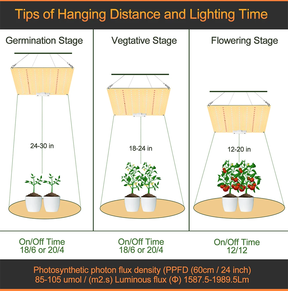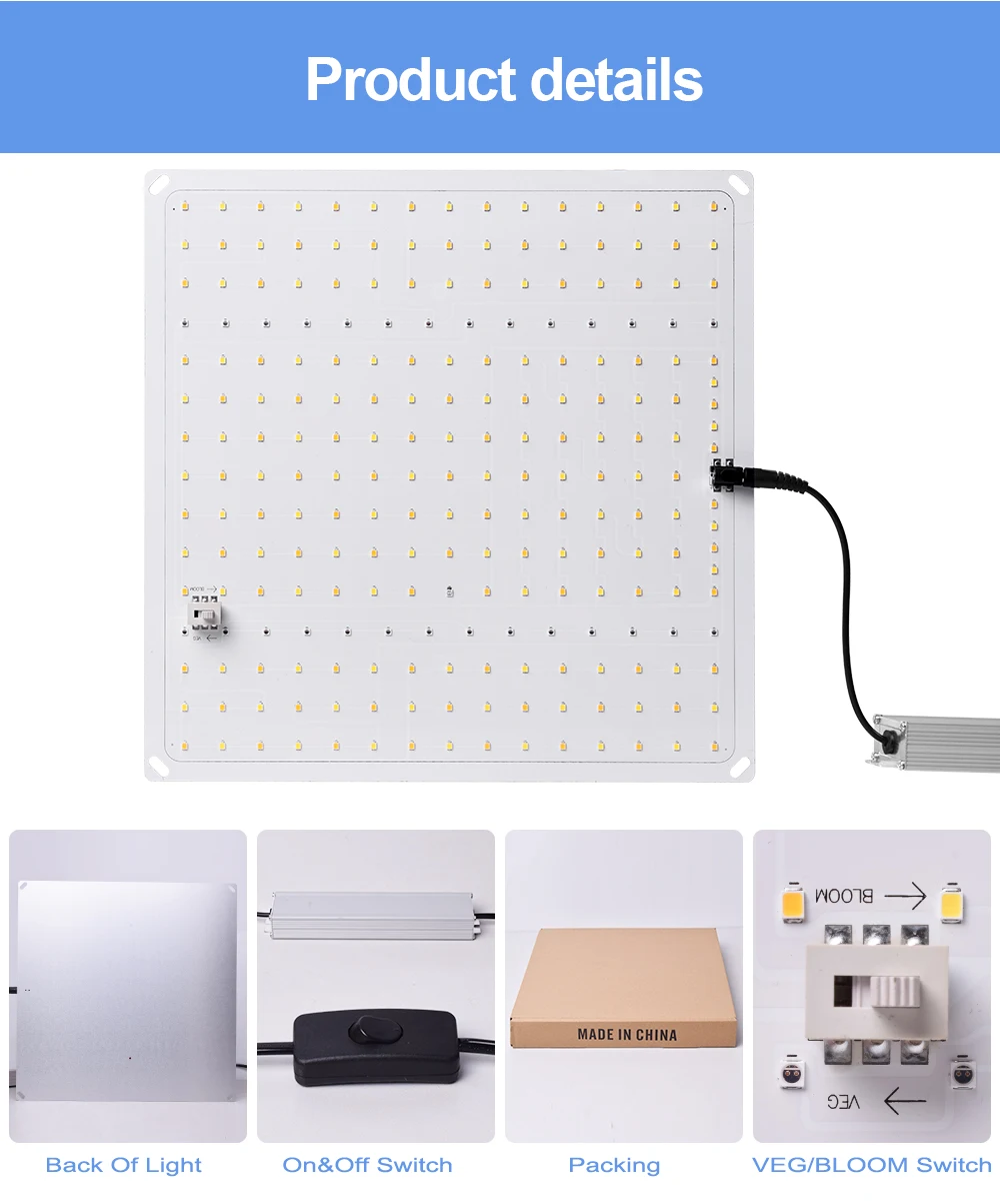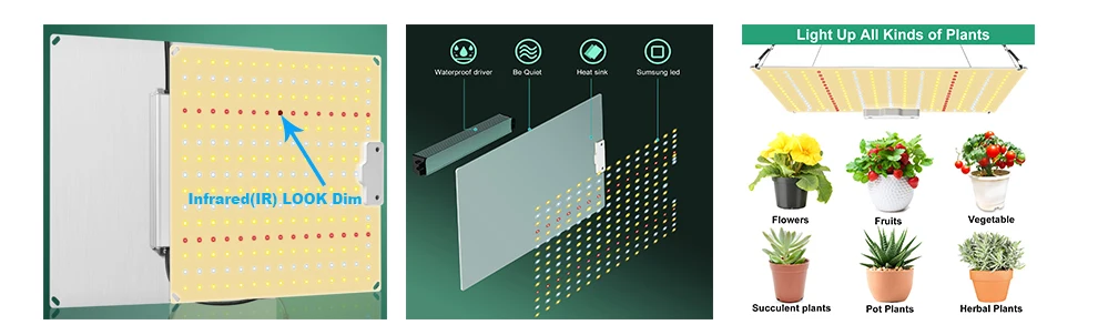 Спектр: 3000K + 5000K + 660NM + 730NM 3000K: теплый белый 5000K: холодный белый 660нм: темно-красный 730 нм: инфракрасный Характеристики: Светодиодный переключатель на плате, вы можете изменить модель VEG и BLOOM Этап VEG: Выключите темно-красный и ИК (660нм и 730нм) Цветовая сцена: Включите темно-красный и ИК (660нм и 730нм)