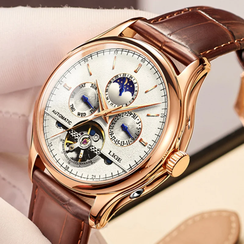 Часы наручные LIGE Мужские автоматические механические, классические водонепроницаемые в стиле милитари, с турбийоном, из натуральной кожи, в стиле ретро
