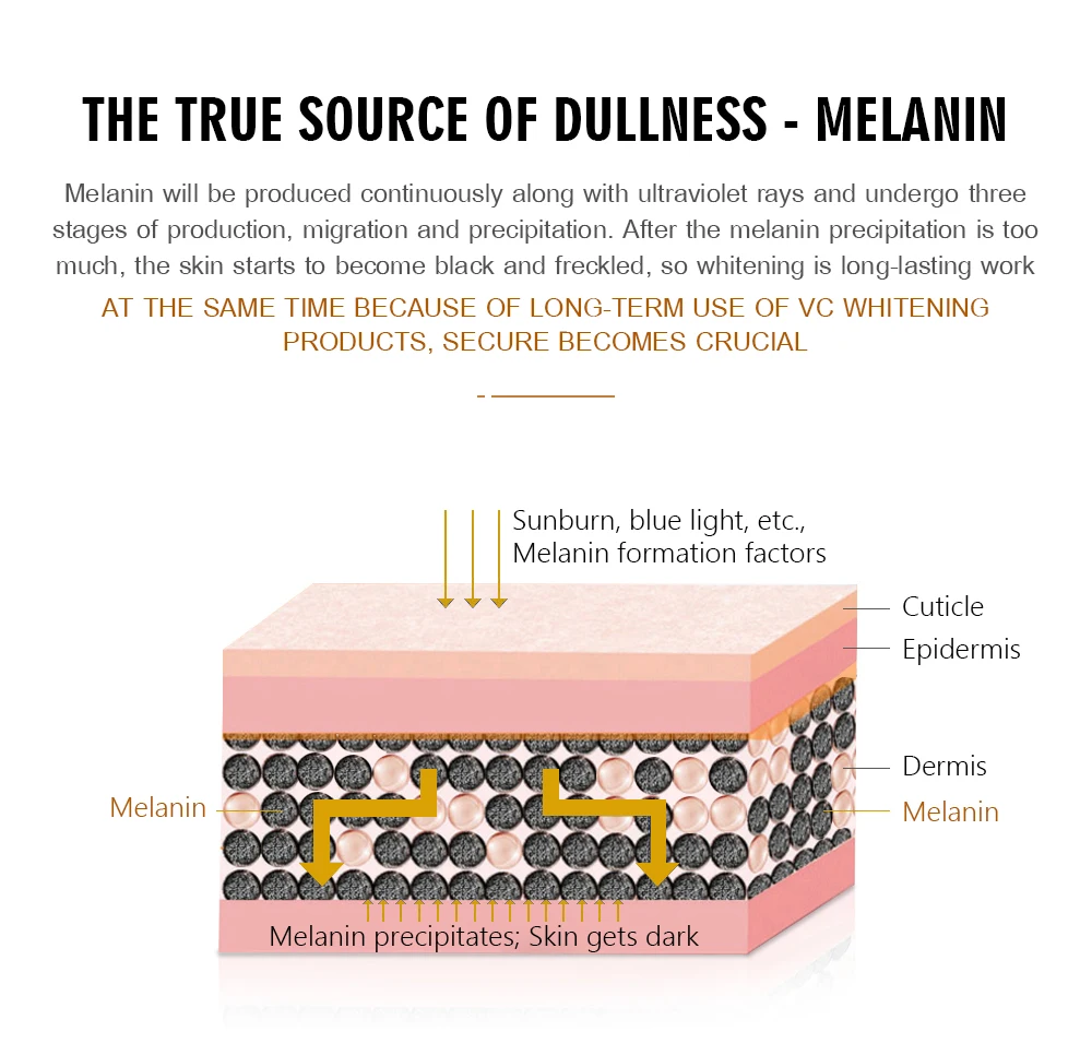 Тусклый, отбеливающий слой кожи за слоем/несколько отбеливающих ингредиентов достигают кожного бота, чтобы осветить кожу от корня