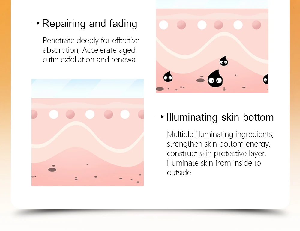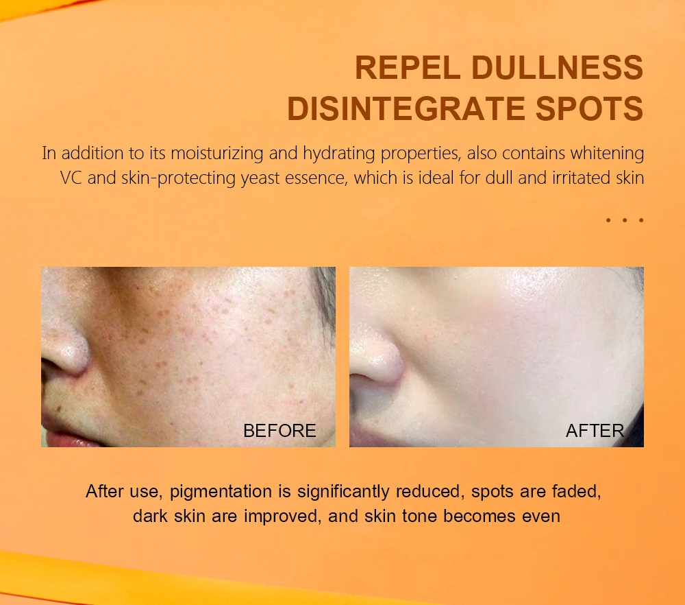 В дополнение к увлажняющим и увлажняющим свойствам, также содержит отбеливающие VC и защищающие кожу дрожжевые эссенции, которые идеально подходят для тусклых и обритмированных морщин ·Перед отправкойПосле использования пигментация значительно уменьшается, пятна выцветают, темная кожа улучшается, а тон кожи становится ровным