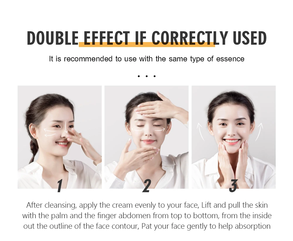Рекомендуется использовать с тем же типом essence ·После очищения нанесите крем равномерно на ваше лицо, приподнимите и очистите кожу ладонью и пальцем живота сверху вниз, изнутри контур лица, мягко погладьте лицо