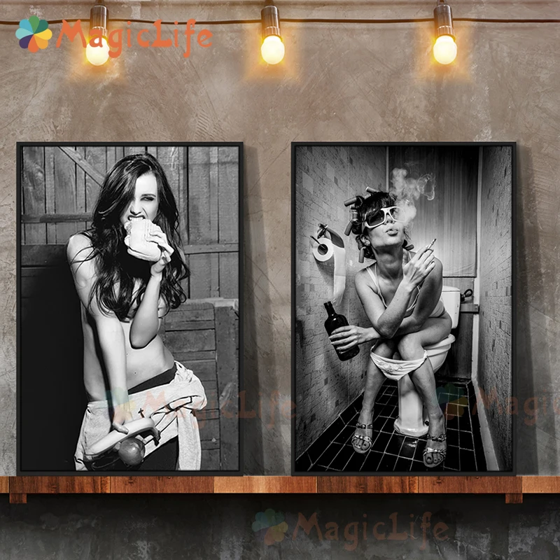 Винтажный постер унитаза с изображением сексуальной женщины и девушки, сидит в туалете, плакаты, настенные картины для гостиной, настенная Картина на холсте без рамки