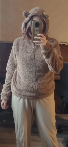 Мягкая,приятная,но это,к сожалению,все плюсы. Заказала 4XL,в надежде,что придет действительно милая объемная толстовка.В итоге,это максимум M,даже не XL. Рукава сшиты странно,неудобно в подмышках,хочется все время как-то отдернуть ткань.Уши пришиты так же странно,не такие круглые,как на фото,а вытянутые,как будто крысиные. Очень обидно,за такую то цену,в 800 с лишним рублей,ожидала намного качественную вещь.