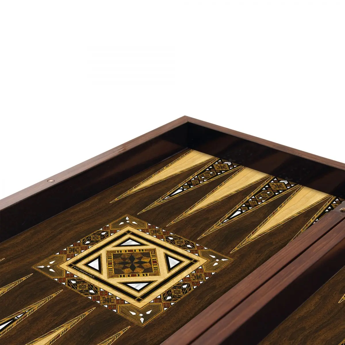 Внешняя поверхность нарды, покрытая глянцевым лаком с мозаичным эффектом, отличается от качественного материала.