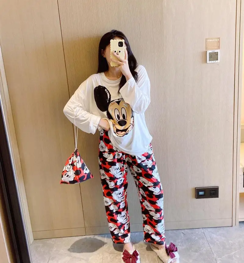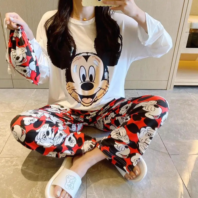 Пижама Минни с мультипликационным принтом Disney для женщин, весна-осень, для девочек, с длинным рукавом + брюки + сумка для хранения, комплект домашней одежды из 3 предметов, ночнушка Пижама