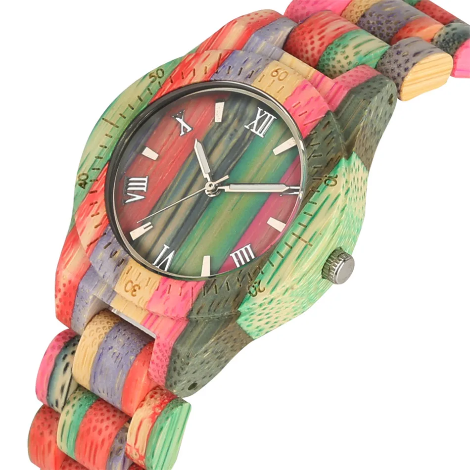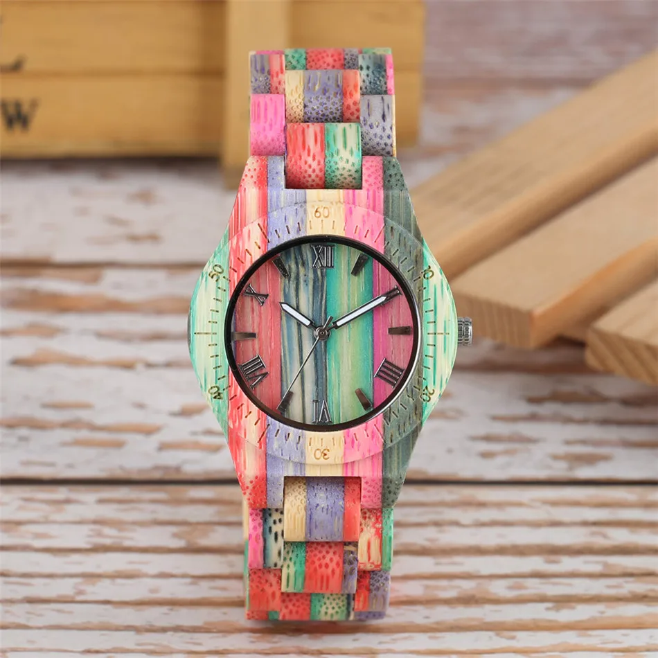 Многоцветные часы с бамбуковым деревянным браслетом, женские кварцевые часы с римскими цифрами, дисплей, полностью деревянный женский браслет, наручные часы, подарки