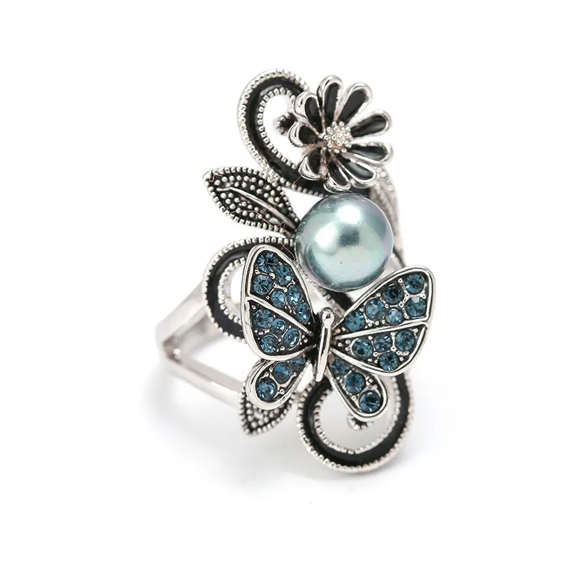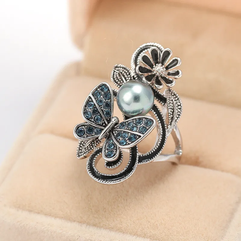 Женское кольцо с жемчугом и бабочкой, Винтажное кольцо серебряного ...