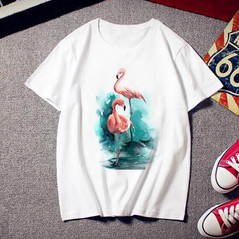 Летняя женская футболка, Женская Повседневная модная футболка с принтом в стиле Харадзюку, с изображением фламинго, белые топы с круглым вырезом, женские футболки с коротким рукавом