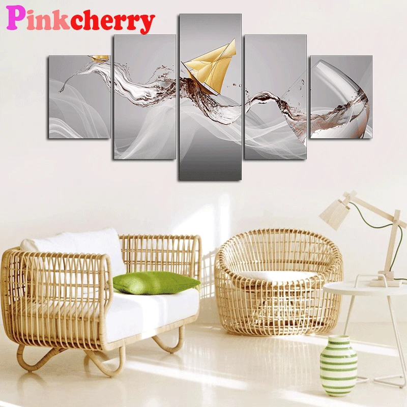 Абстрактная Алмазная вышивка Золотой корабль, мульти-панель, полная круглая 3d-вышивка крестиком, мозаика, алмазная живопись, 5 шт.