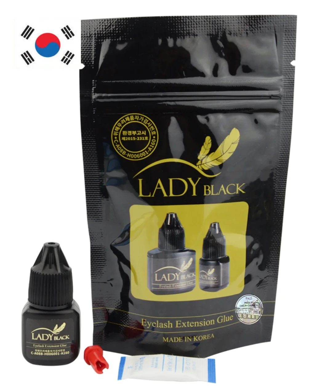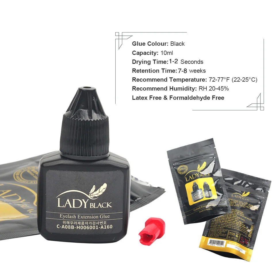 * Lady Black-сертифицированный клей KC для наращивания ресниц.* Время сушки клея быстрее и чувствительность раздражения исчезла без улучшенного продукта. Профессионалы с быстрыми и точными руками полюбят этот клей!* Женский черный клей имеет низкое раздражение, но остается более 4 недель, как и другой сильный раздраженный клей. Уменьшая вязкость делает клей гибким без каких-либо трещин