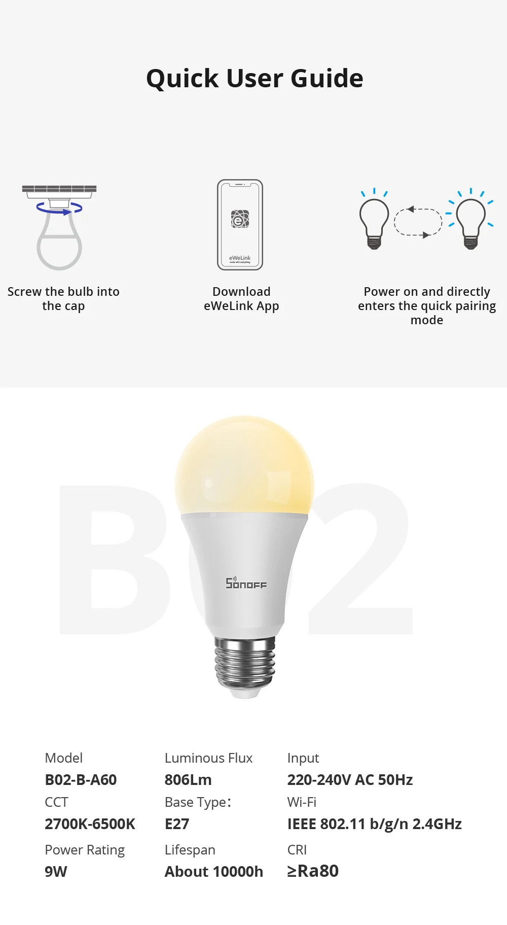 Модель: B02-B-A60 (холодный и теплый); B05-B-A60(RGB);Вход: 220-240 В переменного тока 50 Гц;Wi-Fi: IEEE 802,11 b/g/n 2,4 ГГц;Световой поток: 806 лм;CCT: 2700K-6500KНоминальная мощность: 9 Вт;Срок службы: около 10000 ч;Тип цоколя: E27;