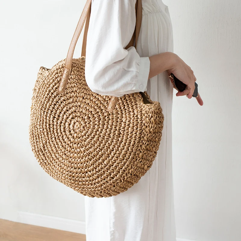 Круглая соломенная сумка в богемном стиле, плетеная женская сумка на плечо, ручная работа, вместительные летние пляжные дамские сумочки
