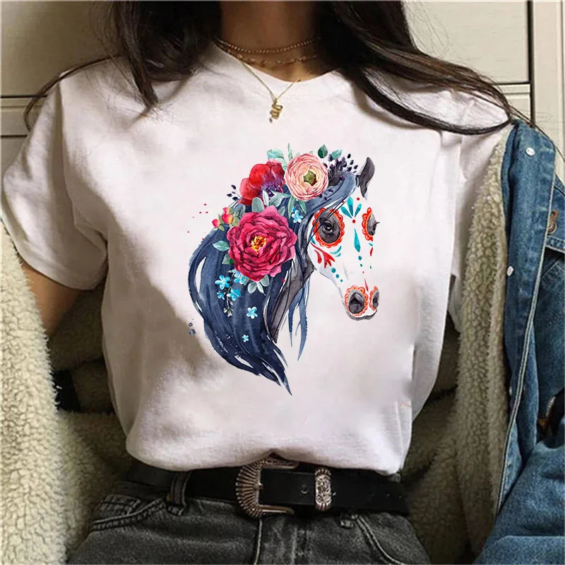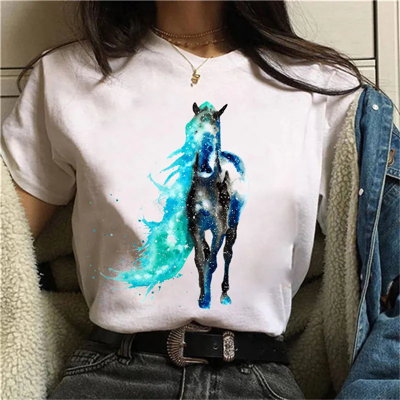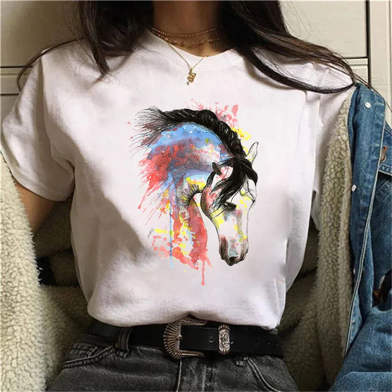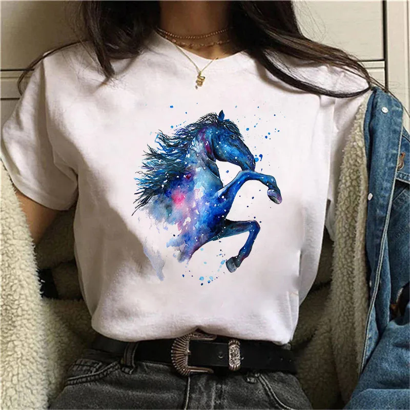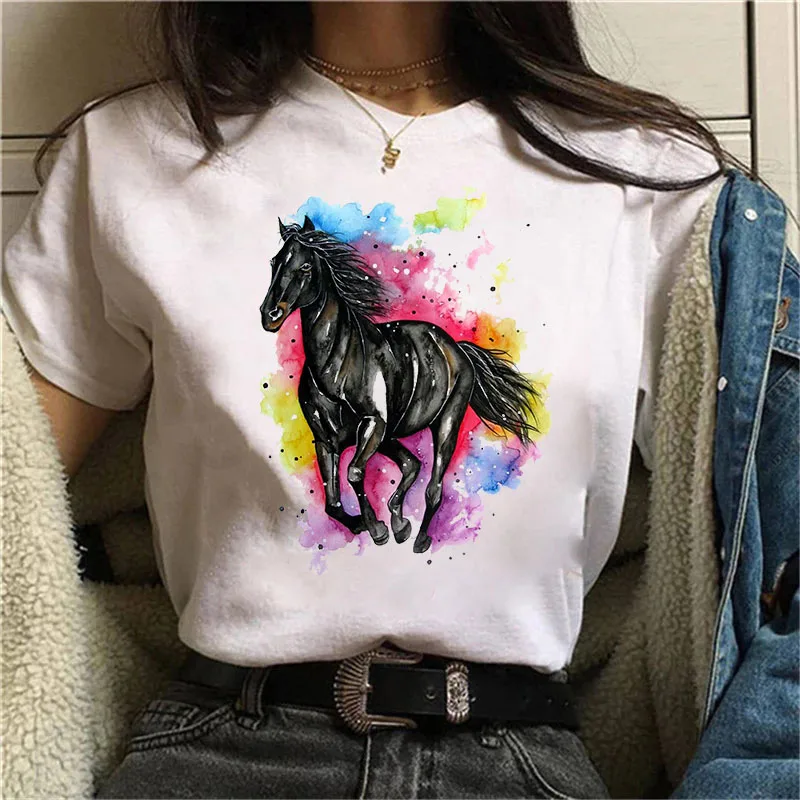 Женская футболка с коротким рукавом, круглым вырезом и принтом лошади