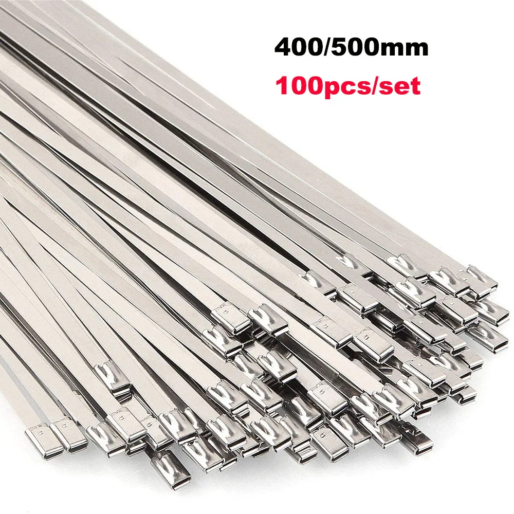 304 # кабельные стяжки из нержавеющей стали Длина 400500 мм самоблокирующийся кабель на молнии многоцелевой металлический выхлопной обмотки блокировки 100 шт стяжки