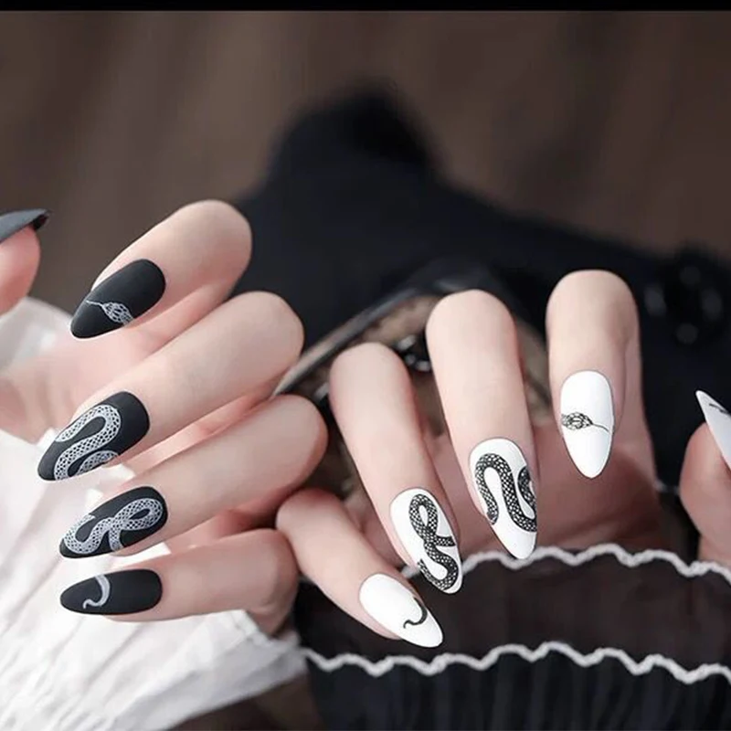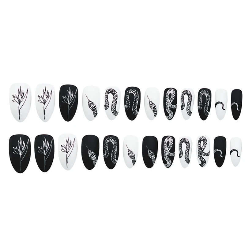 24 шт./компл. темно-черные и белые накладные ногти в стиле панк со змеиным узором, матовые искусственные стилеты для дизайна ногтей, накладные ногти с клеем