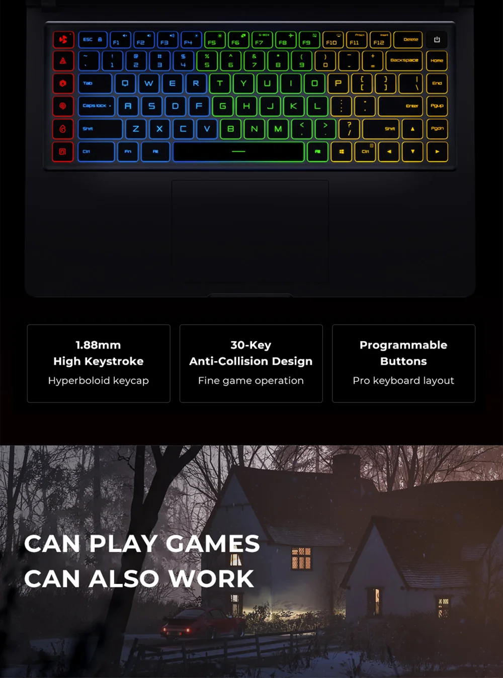 Полноразмерная четырехзонная клавиатура с подсветкойСтеклянная Сенсорная панель может обеспечить точное управление курсором и функции управления жестами несколькими пальцами, такие как прокрутка на весь экран, переключение программ, зум экрана и другие жесты (технология Microsoft PTP clickpad)