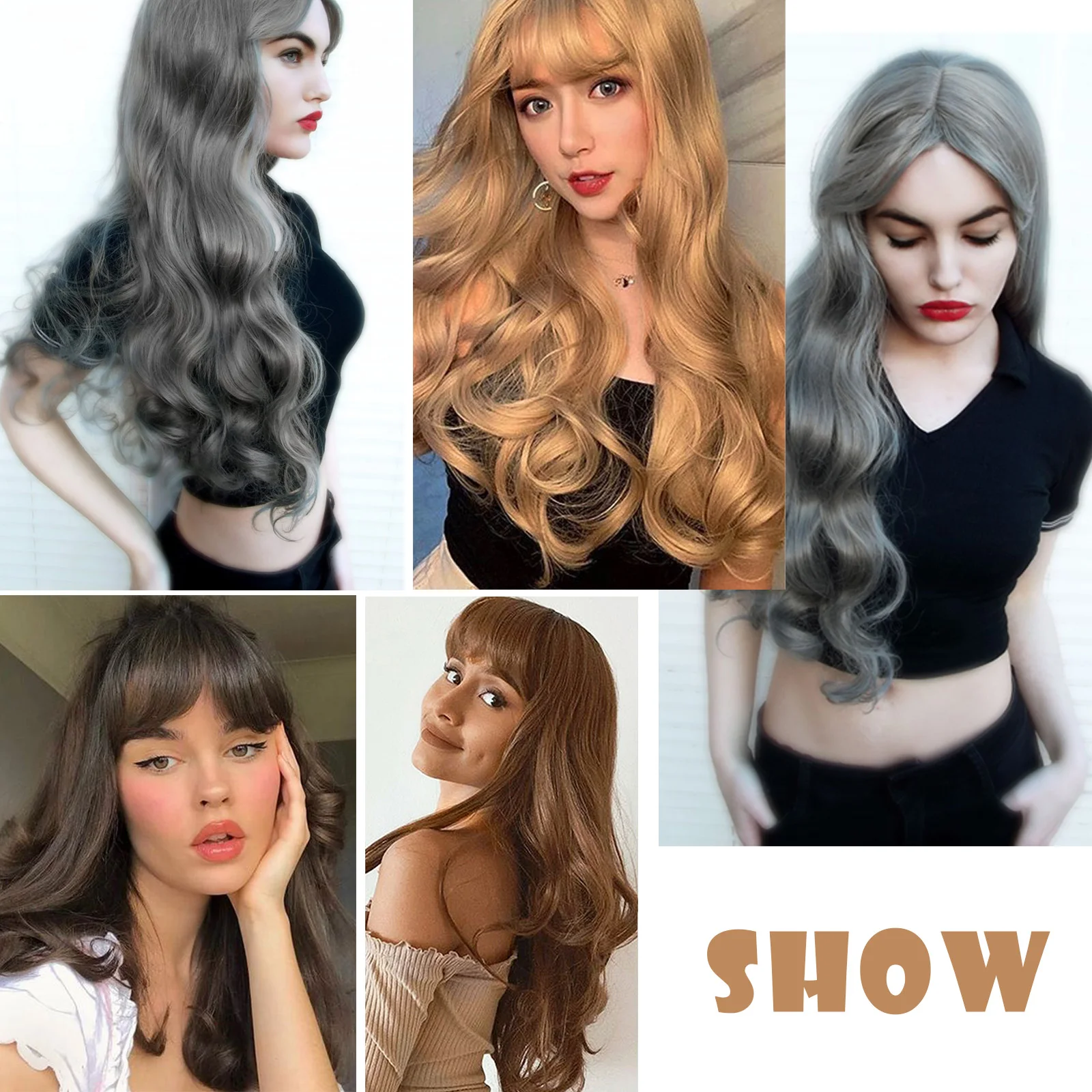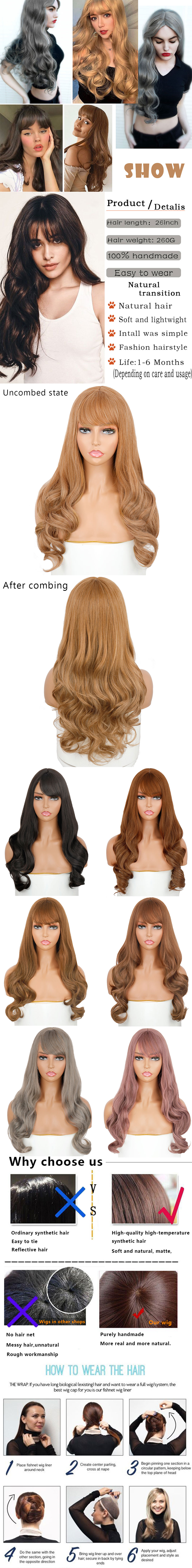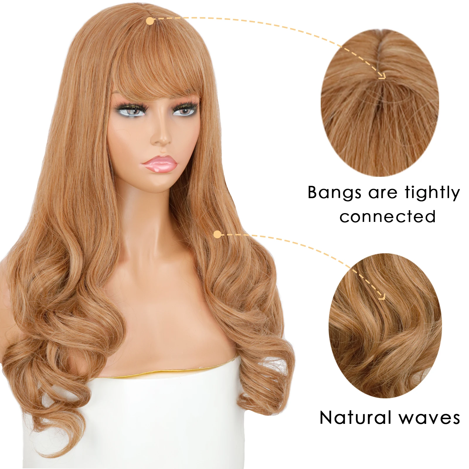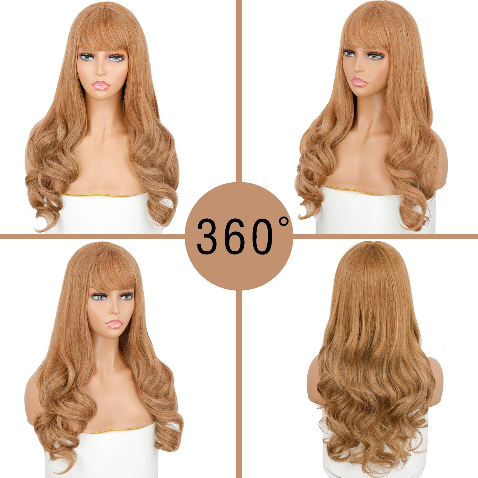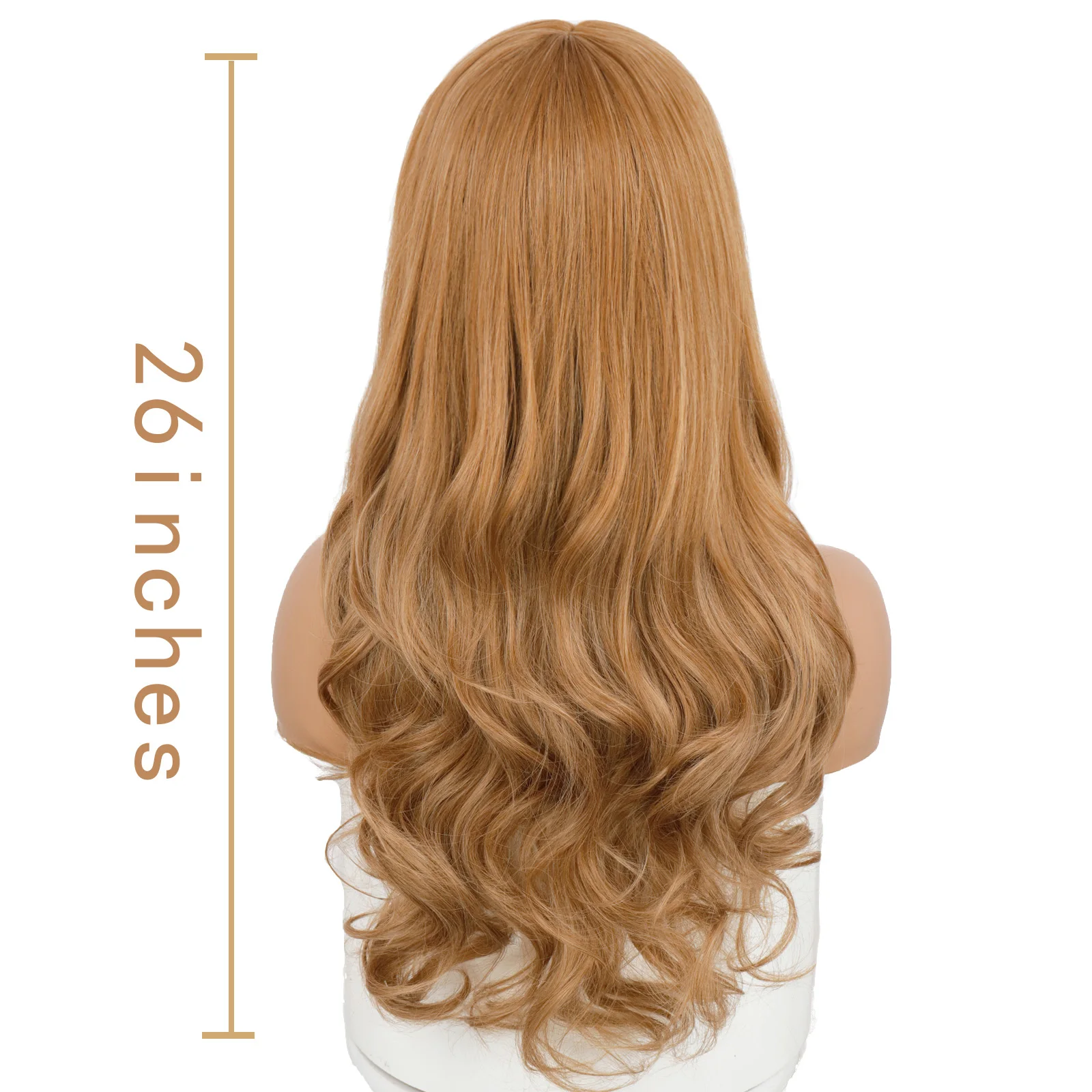 Длинный волнистый парик с челкой для афроамериканских женщин, синтетические волосы, Золотойкоричневый парик для ежедневного использования вечерние, Косплея