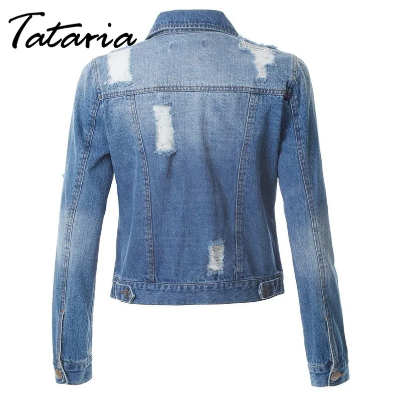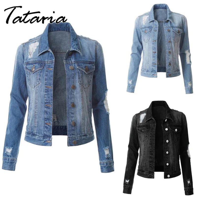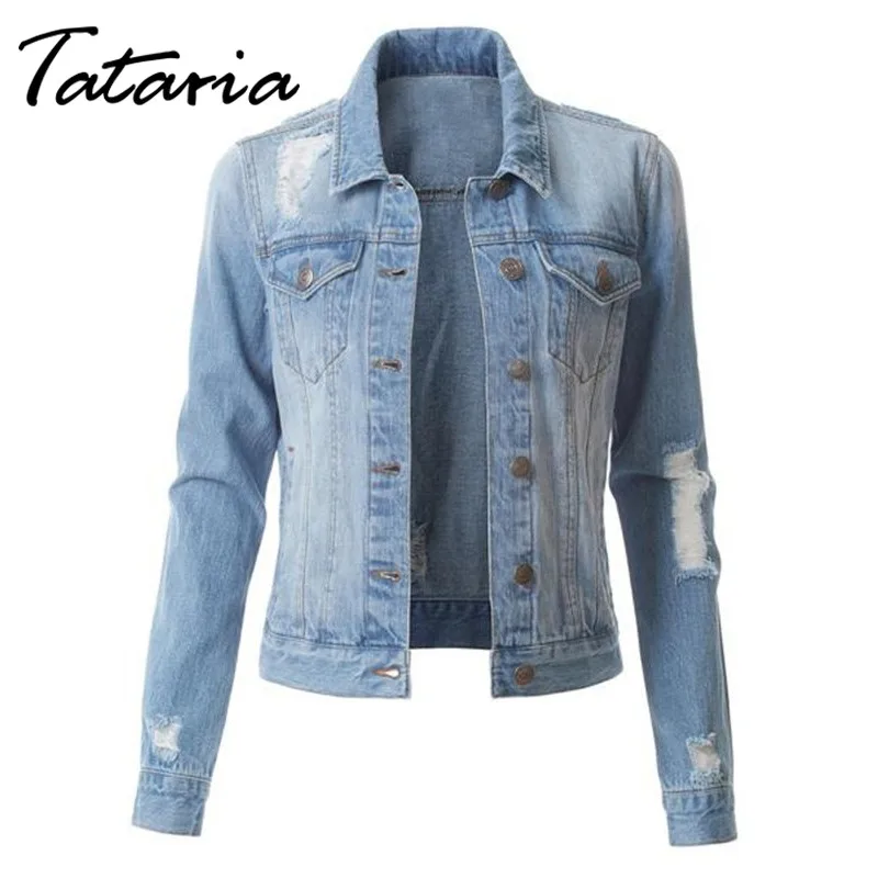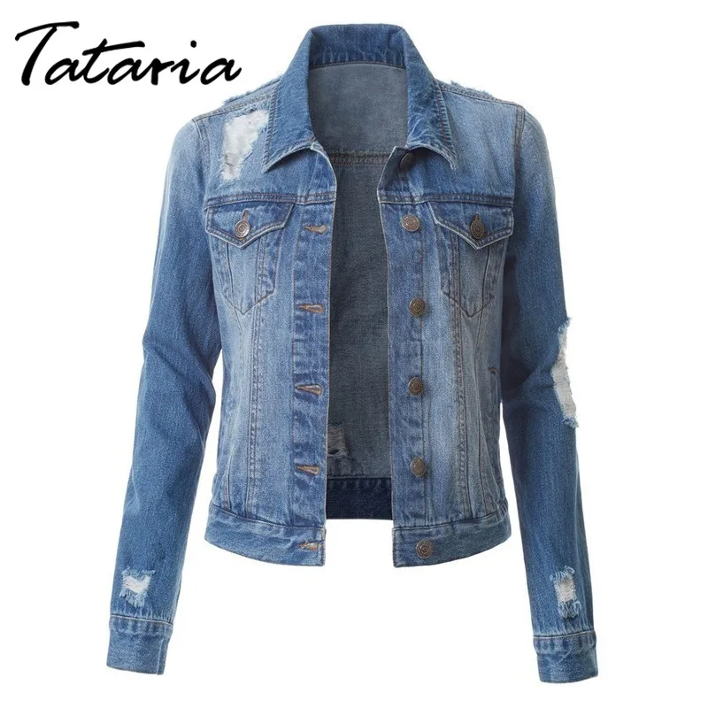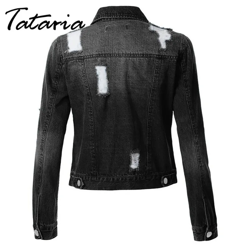 Женская короткая джинсовая куртка, винтажная Свободная куртка из денима с дырками, весна размера плюс