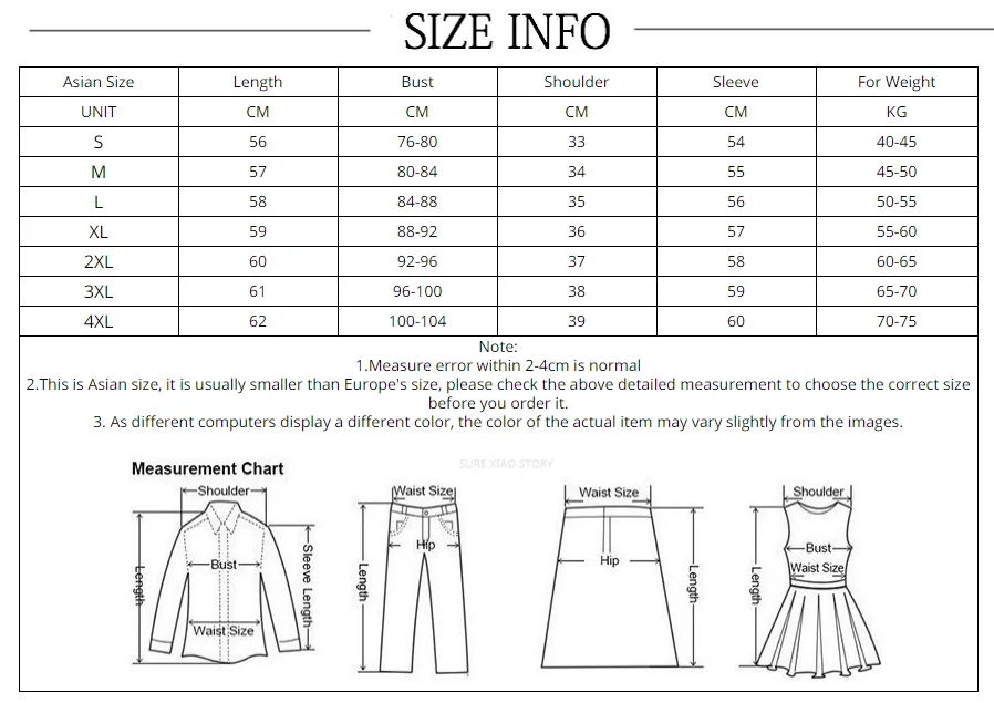 2. Это Азиатский Размер, он обычно меньше европейского размера, пожалуйста, проверьте приведенные выше подробные измерения, чтобы выбрать правильный размер перед заказом.