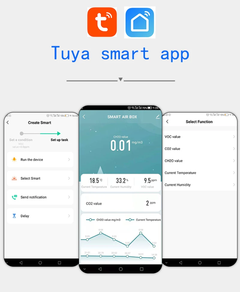 После подключения к приложению, он может быть связан с различными продуктами smart home. Например, при обнаружении чрезмерного формальдегида/Лос умный очиститель воздуха автоматически включается; Когда превышен углекислый газ, Умный вентилятор свежего воздуха автоматически включается; Когда температура ненормальная, температура кондиционера автоматически регулируется; Когда влажность слишком низкая или слишком высокая, Смарт-увлажнитель будет включаться/выключаться автоматически; Когда определённый параметр будет обнаружен, чтобы превысить стандарт, на будильник будет отправлено сообщение (вышеуказанная функция умной связи должна быть совместима с продуктом smart home)