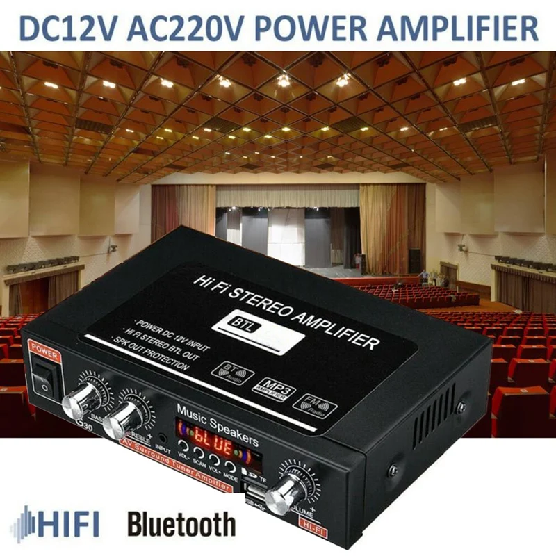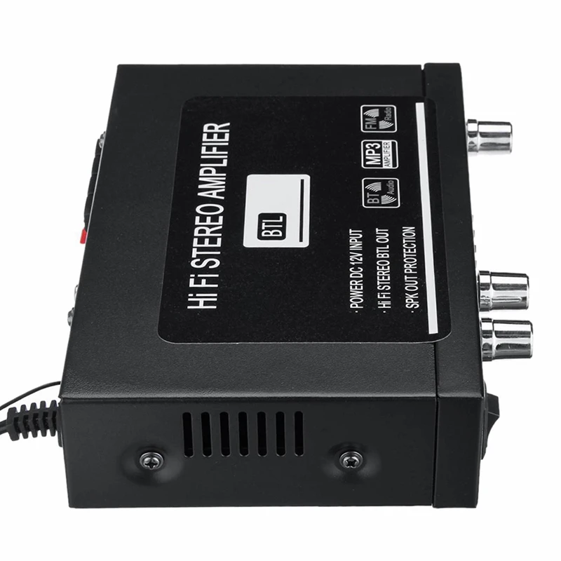 Цифровой мини-усилитель мощности звука Hi-Fi с bluetooth.TF-карта, AUX, U-диск, воспроизведение в формате MP3, поддержка беспроводного соединения bluetooth.Поддерживает FM-стерео радио. С высокими частотами, басами и регулятором громкости, очень прост в использовании.Низкое Искажение обеспечивает более четкий, мощный и мощный звук.Два основных канала выхода. С функцией дистанционного управления. Питание постоянного/переменного тока, подходит для дома или вашего автомобиля.Версия Bluetooth: 4,0Батарея пульта дистанционного управления: батарея кнопки CR2025 не встроенаНоминальное сопротивление: 4-16 ОмНоминальная мощность: 15 + 15 Вт (рекомендуется подключать пару динамиков ниже 6 дюймов)Пиковая мощность: 800 ВтТребования к источнику питания: 12 В постоянного тока/220 В переменного тока/110 ВВведение в функции: съемная TF-карта/U-диск с разъемом/с пультом дистанционного управления/с FM-радио/с BluetoothАудиовход: 3,5 отверстий в переднем сиденье, заднее сиденье lotus можно подключить: компьютер/MP3 / DVD / CD и другие аудиосигналыАудиовыход: левый + правый зажим R для выхода канала, положительный и отрицательный, один динамикМеры предосторожности:1. Внешнее соединение источника питания должно быть четко разделено на положительный и отрицательный полюса, а промежуточное ядро сиденья усилителя мощности постоянного тока-положительное.2. Не храните MP3s во внутренних картах и USB-накопителях в папках.Тип штекера: штекер для США, подходит для Канады, Индии, Мексики, Таиланда, США, Филиппин, Тайваня и так далее.Цвет: черныйМатериал: металлПосылка1 х усилитель мощности1 х пульт дистанционного управленияВ комплект входит только указанное выше содержимое, другие продукты в комплект не входят.Примечание: светильник вая съемка и различные дисплеи могут привести к тому, что цвет товара на изображении будет немного отличаться от реального. Допустимая погрешность измерения +/- 1-3 см.