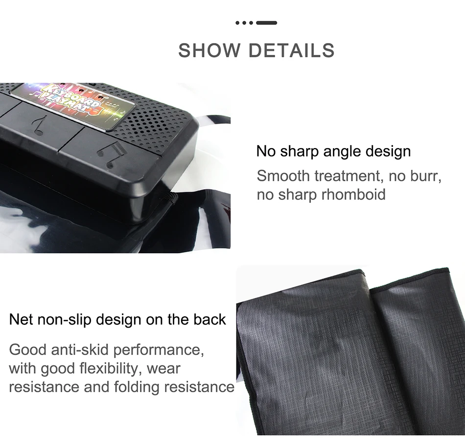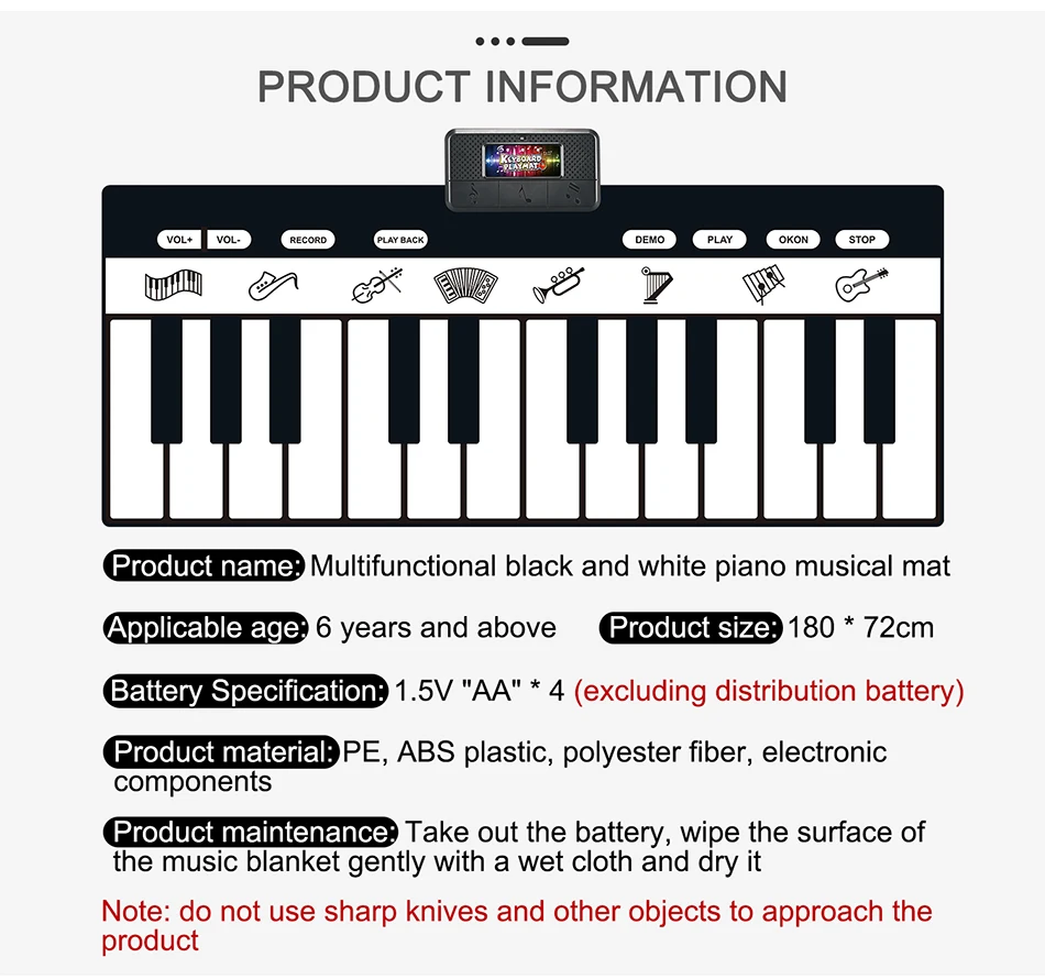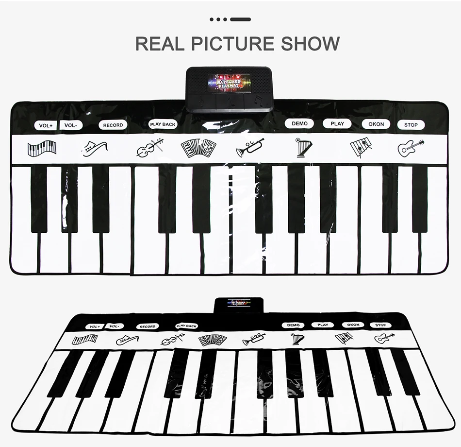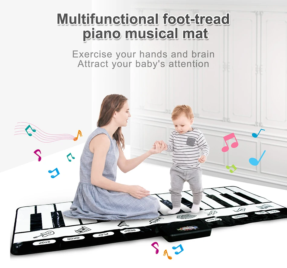 1. Дети не только развивают свой музыкальный интеллект, развивают руки и мозги, тренируют слуховую систему, но и привлекают внимание ребенка и приносят чистое удовольствие через этот коврик.2. Многофункциональная поддержка типа игры: Взаимодействие родителей и детей, взаимодействие друзей, забавное.3. Толщина черно-белых клавиш и расстояние между ними в самый раз. Вы можете использовать как руки, так и ноги для физических упражнений.4. Bulit-in 10 аккомпанементных песен, легко воспроизводить красивую музыку (Нажмите черный ключ для переключения музыки).5. Есть режим записи и режим воспроизведения. Он может записывать все творения ребенка и воспроизводить их, чтобы ребенок мог наслаждаться их творением.6. Каждая клавиша имеет соответствующую функцию, может легко переключаться. Если вы не нажмете какую-либо клавишу в течение 1 минуты, продукт превратится в спящий энергосберегающий режим, вы просто нажмите любую клавишу для перезапуска.