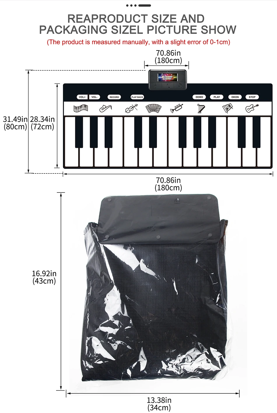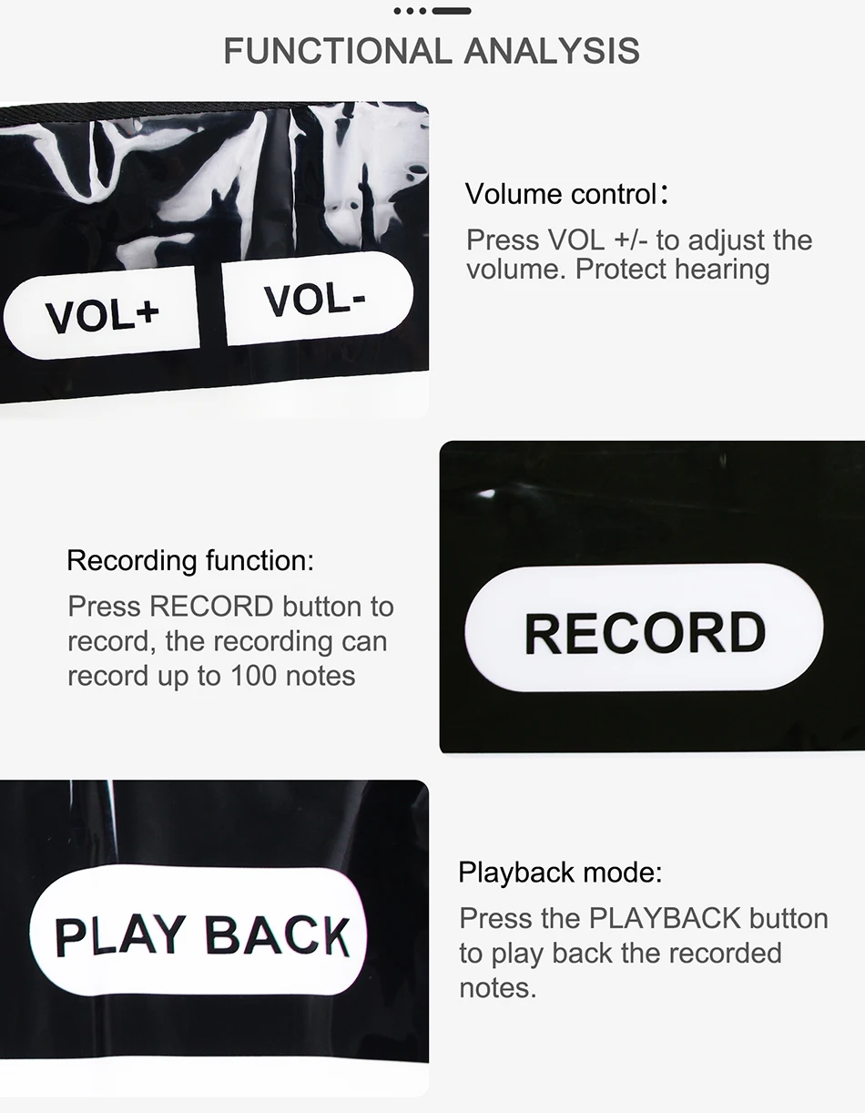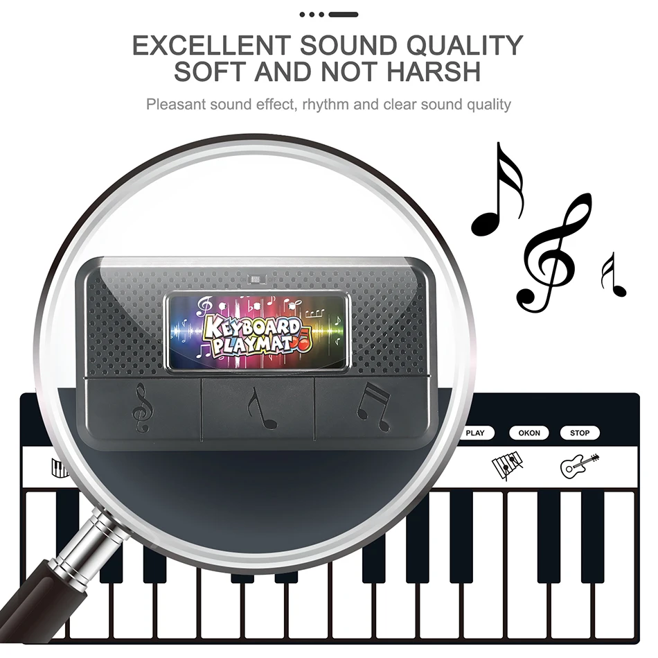 1. Дети не только развивают свой музыкальный интеллект, развивают руки и мозги, тренируют слуховую систему, но и привлекают внимание ребенка и приносят чистое удовольствие через этот коврик.2. Многофункциональная поддержка типа игры: Взаимодействие родителей и детей, взаимодействие друзей, забавное.3. Толщина черно-белых клавиш и расстояние между ними в самый раз. Вы можете использовать как руки, так и ноги для физических упражнений.4. Bulit-in 10 аккомпанементных песен, легко воспроизводить красивую музыку (Нажмите черный ключ для переключения музыки).5. Есть режим записи и режим воспроизведения. Он может записывать все творения ребенка и воспроизводить их, чтобы ребенок мог наслаждаться их творением.6. Каждая клавиша имеет соответствующую функцию, может легко переключаться. Если вы не нажмете какую-либо клавишу в течение 1 минуты, продукт превратится в спящий энергосберегающий режим, вы просто нажмите любую клавишу для перезапуска.