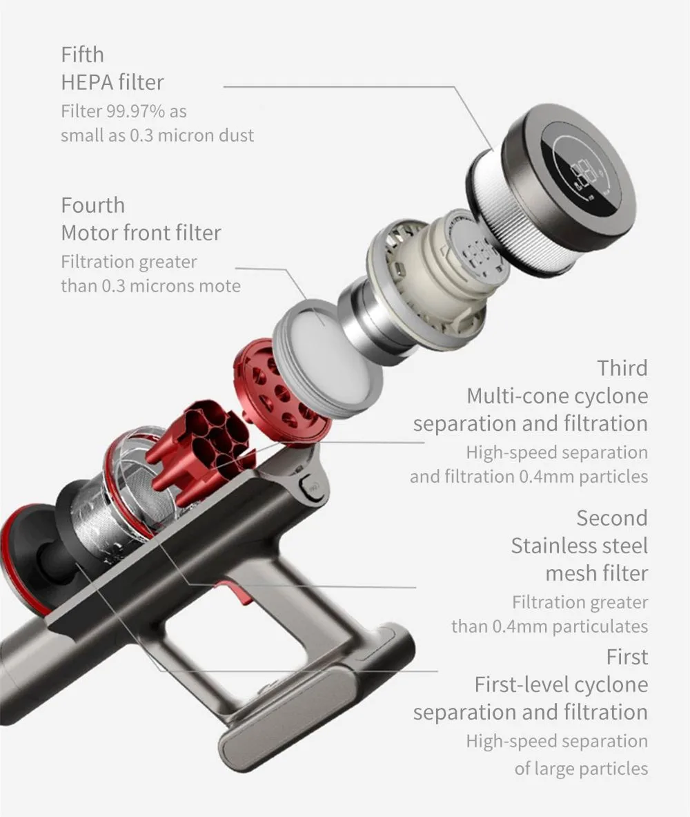 Пяти этапах HEPA фильтрации задерживает пыль, как малых по мере того как 0,3 микрона и 99.99% аллергенов. Всасывание в мусорное ведро, не входя в двигатель пылесоса, также может избежать вторичного загрязнения во время следующего использования.