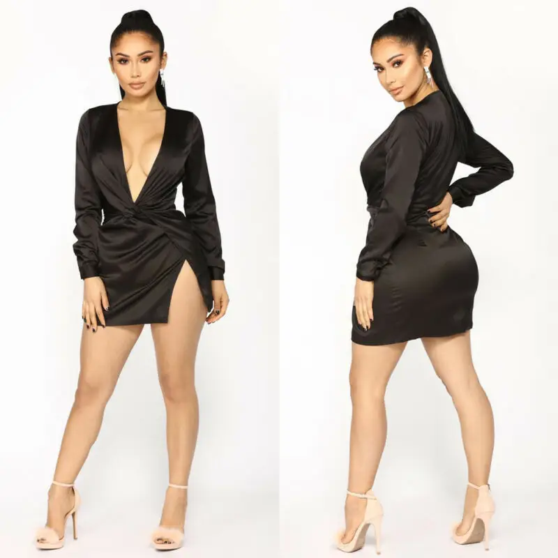 Женское атласное мини-платье, с глубоким V-образным вырезом
