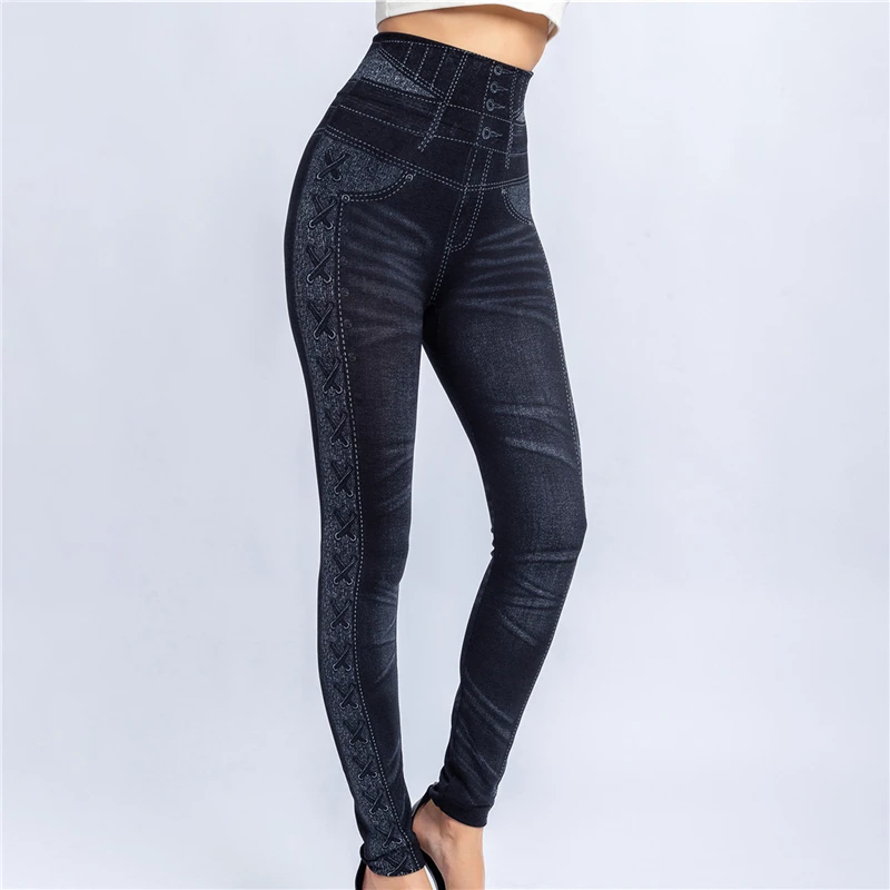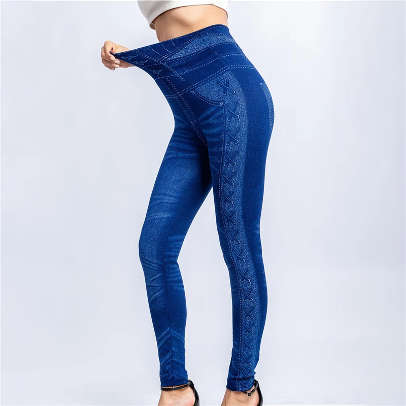 Женские спортивные женские имитированные джинсы, джинсы Леггинсы Джеггинсы Streth детские брюки с карманами и с плетеным кружевом; Цвет синий, черный; Большие размеры тонкие леггинсы джинсы облегающие, брюки